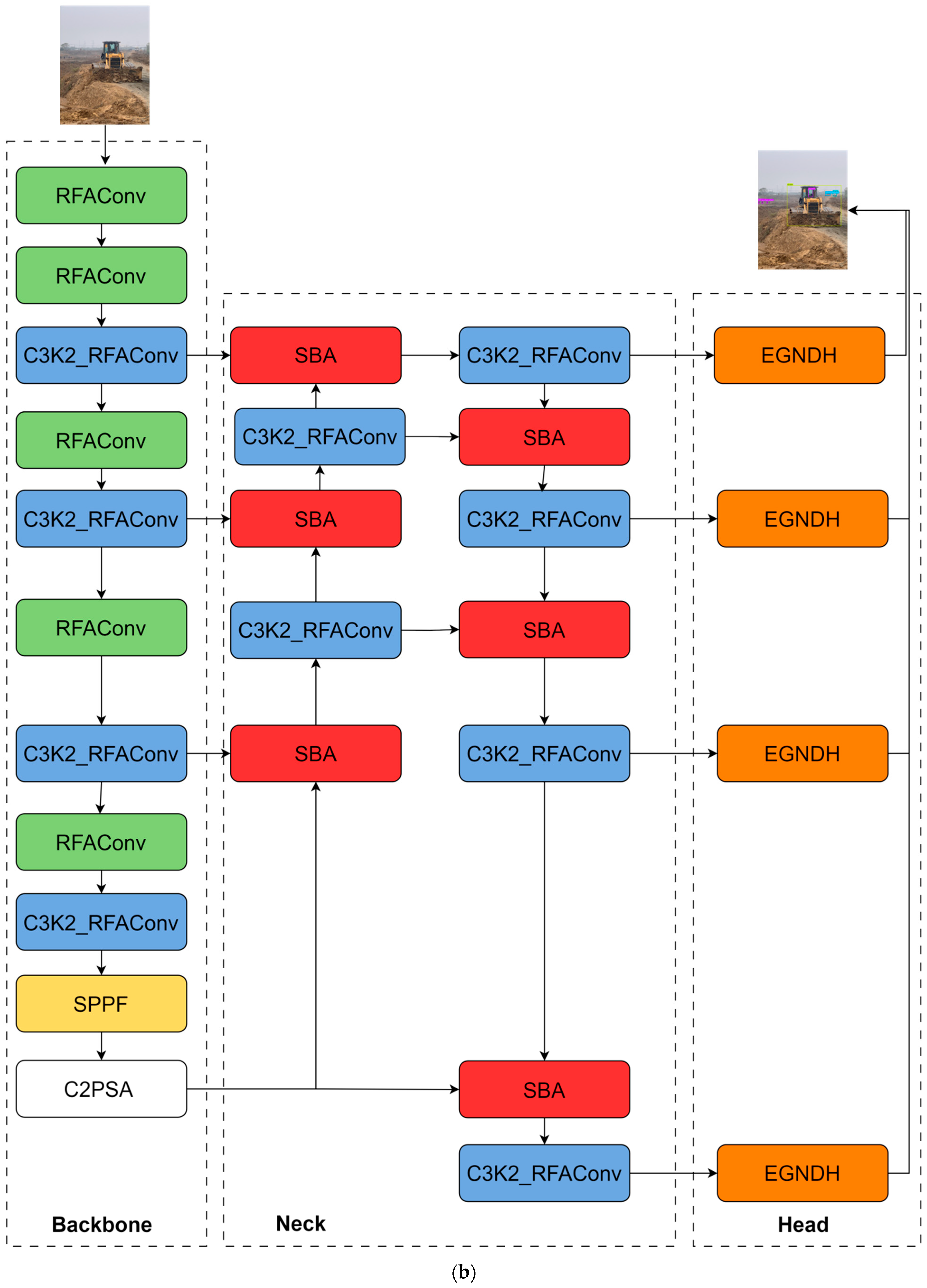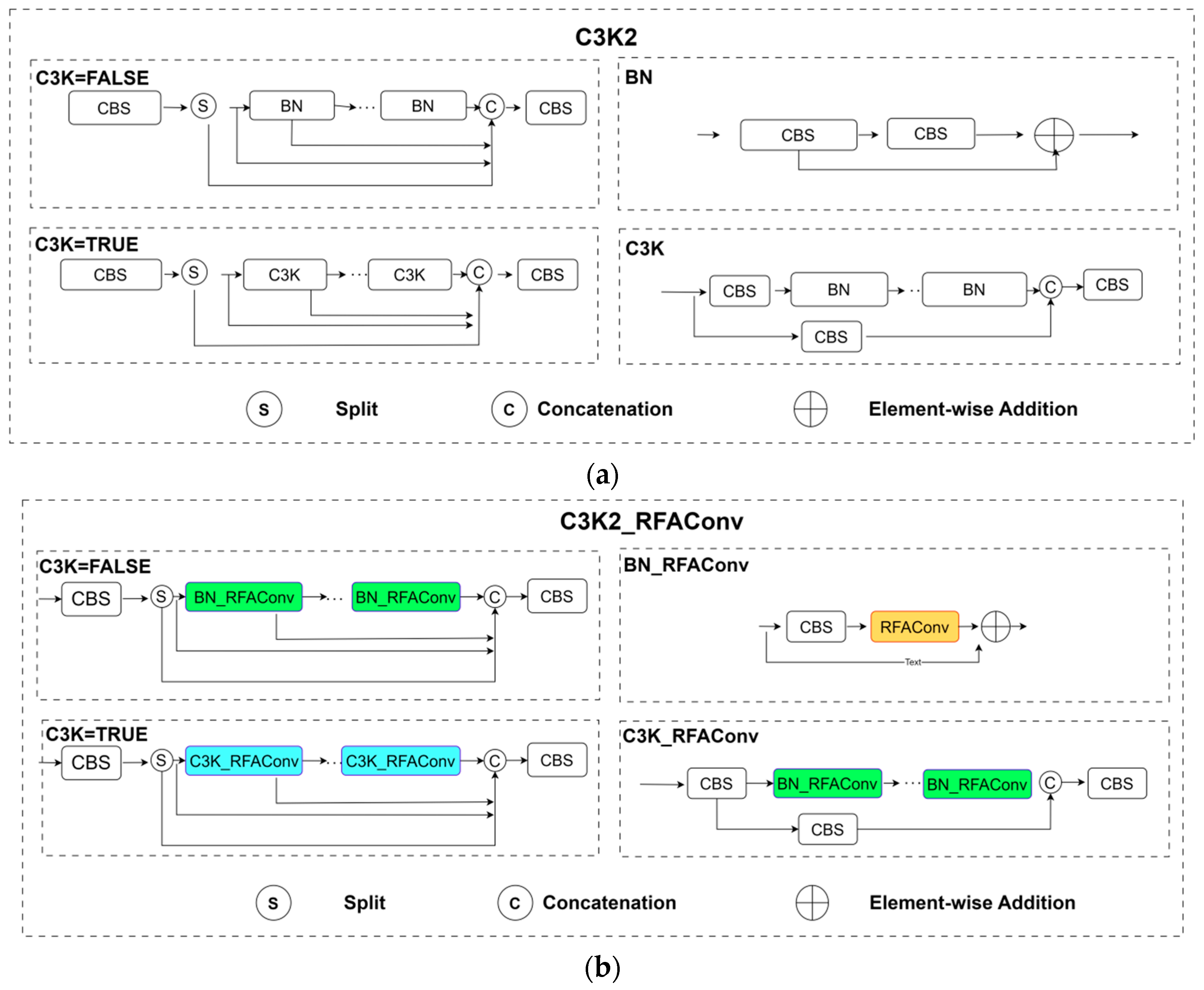 Figure 2b shows, the CBS of standard Bottleneck structures within C3K2 modules is replaced with RFAConv in the backbone and neck networks. The integration strategy of replacing CBS with RFAConv in both backbone and neck networks ensures that the enhanced contextual feature extraction capabilities of RFAConv are consistently applied across both the feature extraction (backbone) and feature fusion (neck) stages. This strengthens the model’s overall capability to distinguish targets from intricate mining backgrounds while maintaining the lightweight characteristics suitable for resource-constrained mining environments.