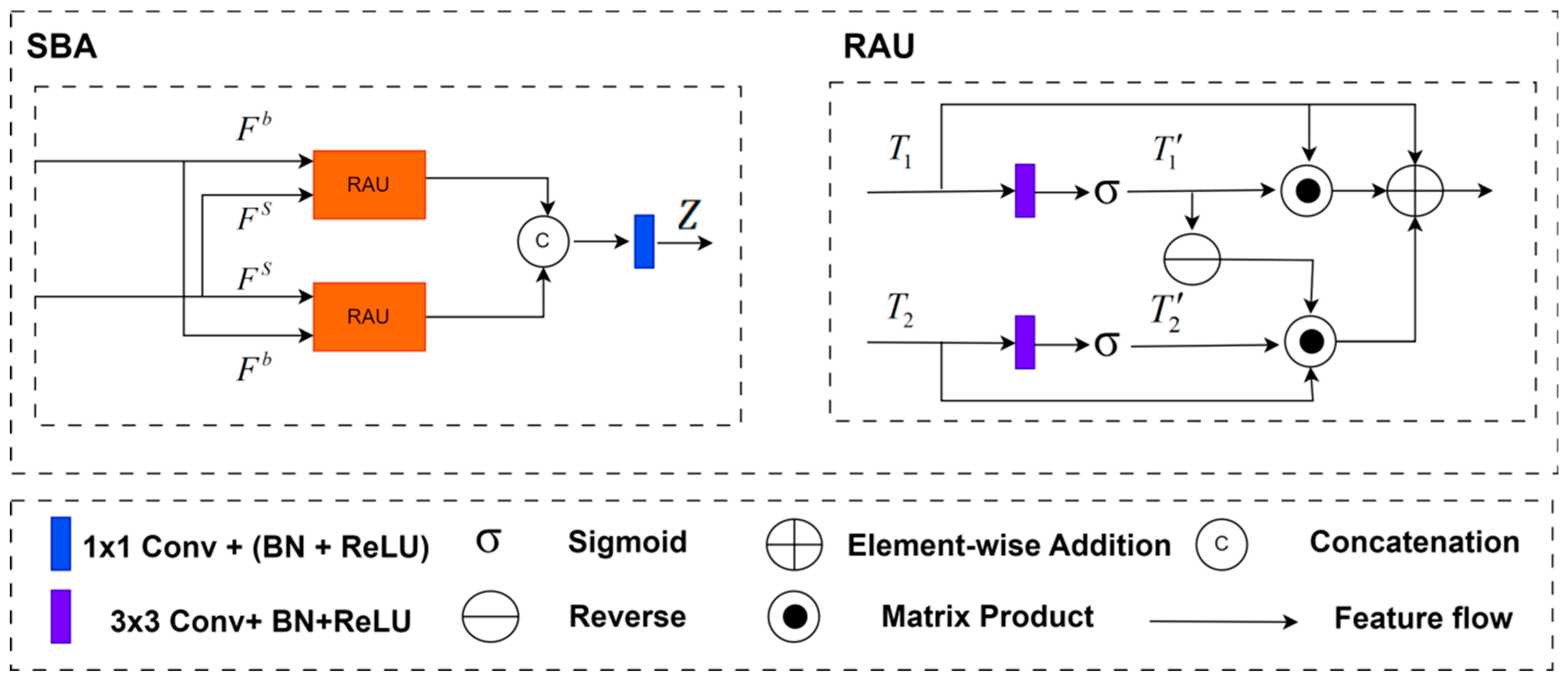 Fs, which denote the shallow-level and deep-level information, respectively, are fed into two RAU blocks through distinct pathways. This compensates for the missing spatial boundary information in high-level semantic features and the absent semantic information in low-level features. Finally, the outputs of the two RAU blocks are concatenated after a 3 × 3 convolution. This aggregation strategy achieves robust combination of different features and refines the coarse features. The RAU block function