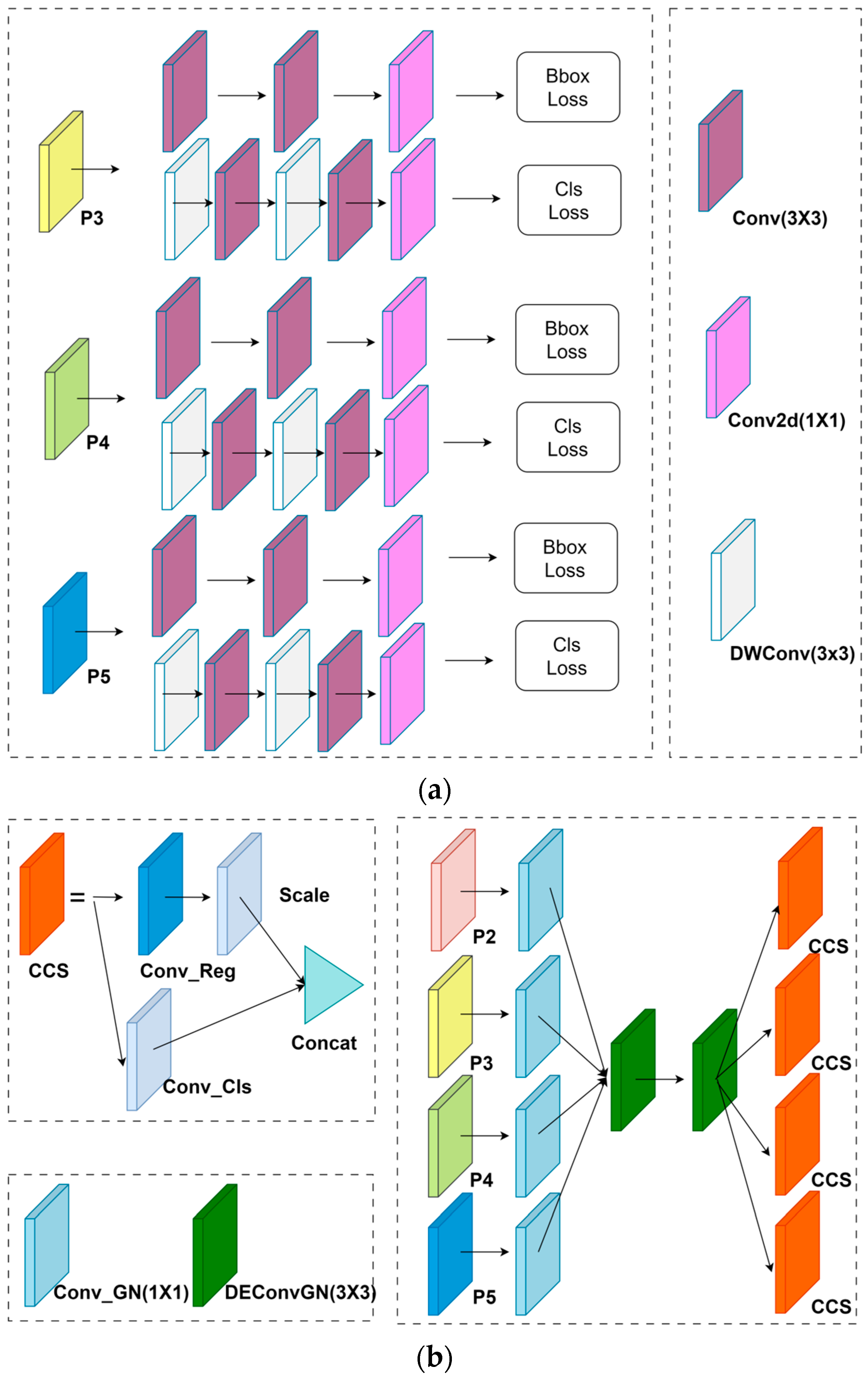 Figure 6b, the EGNDH structure addresses the aforementioned limitations through several key advantages specifically designed for mining scenarios. First, the introduction of Group Normalization (GN) replaces Batch Normalization (BN) as the normalization mechanism, fundamentally eliminating the dependency on batch statistics. Unlike BN, which computes normalization statistics across the batch dimension and becomes unstable with small batch sizes, GN divides channels into groups and computes statistics within each group independently of batch size. This design ensures stable and accurate normalization even when batch sizes are as small as 1. This makes EGNDH particularly suitable for mining detection scenarios where GPU memory constraints limit batch sizes. The stable normalization provided by GN significantly enhances both localization accuracy (precise bounding box prediction) and classification accuracy (correct class prediction). This is especially critical for detecting small workers and distinguishing them from similar background elements. Second, the parameter sharing mechanism implemented through two serially shared convolutional layers dramatically reduces the total parameter count while improving detection performance. Instead of maintaining three independent sets of convolutional parameters (one for each detection scale), EGNDH shares convolutional kernels across all detection scales (P2, P3, P4, P5). This enables the network to learn common feature representations that are beneficial for all scales. This parameter sharing not only reduces the memory footprint and computational cost, making the model more lightweight and suitable for resource-constrained mining monitoring systems, but also facilitates information exchange and knowledge transfer across different scales. This allows the network to leverage complementary information from high-resolution features (for small targets) and low-resolution features (for large targets). Third, the serial architecture of shared convolutional layers creates a progressive feature refinement pipeline, where features from different scales are processed through the same learned transformations, ensuring consistent feature representations across scales. This consistency is particularly important for mining scenarios where the same target types (workers, vehicles) appear at multiple scales, enabling the network to maintain coherent detection strategies. Fourth, the integration of GN with shared convolutions creates a synergistic effect. GN provides stable normalization that enables effective parameter sharing, while shared parameters allow GN to learn more generalizable normalization statistics that benefit all detection scales. The synergistic integration of GN with shared convolutions results in improved detection accuracy, especially for challenging cases such as small targets, occluded objects, and targets with ambiguous boundaries. These are common in mining environments. Furthermore, the lightweight design of EGNDH, achieved through parameter sharing and efficient GN operations, maintains real-time inference capabilities while significantly improving detection performance. This makes it ideal for real-time safety monitoring applications in mining operations. The structure of the EGNDH module is illustrated in