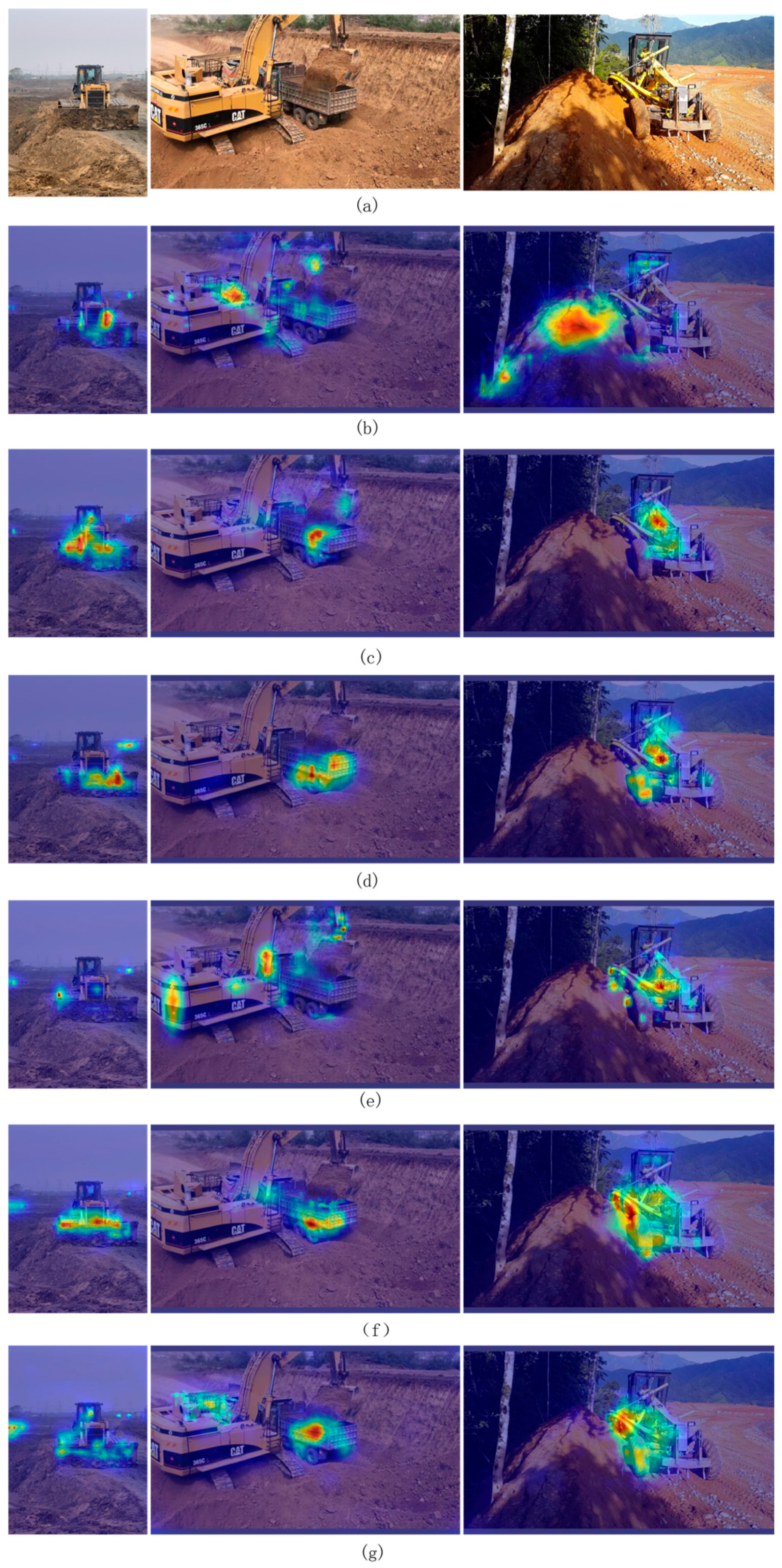 Figure 4a, the fixed pooling window size and repetition count in SPPF may lead to information loss at certain scales. This is particularly problematic when handling very large or extremely small targets, failing to adequately adapt to all types of input data or application scenarios. Specifically, SPPF’s reliance on fixed-window max pooling operations creates several critical drawbacks. (1) The fixed window size cannot adapt to the diverse scale distribution of mining targets, causing information loss for targets that do not match the predefined pooling scales. (2) Max pooling operations inherently discard detailed spatial information by selecting only the maximum value within each window. This is particularly detrimental for small targets where fine-grained features are essential for accurate detection. (3) The non-learnable nature of pooling operations means that SPPF cannot adapt its feature extraction strategy based on the input content. This makes it unable to prioritize critical regions or adjust to varying target characteristics. The three limitations described above—fixed window size, information loss from max pooling, and non-learnable operations—significantly constrain the algorithm’s performance and practicality when dealing with complex variations and challenging ill-posed regions in mining scenarios. This leads to degraded detection accuracy for both small workers and large vehicles.