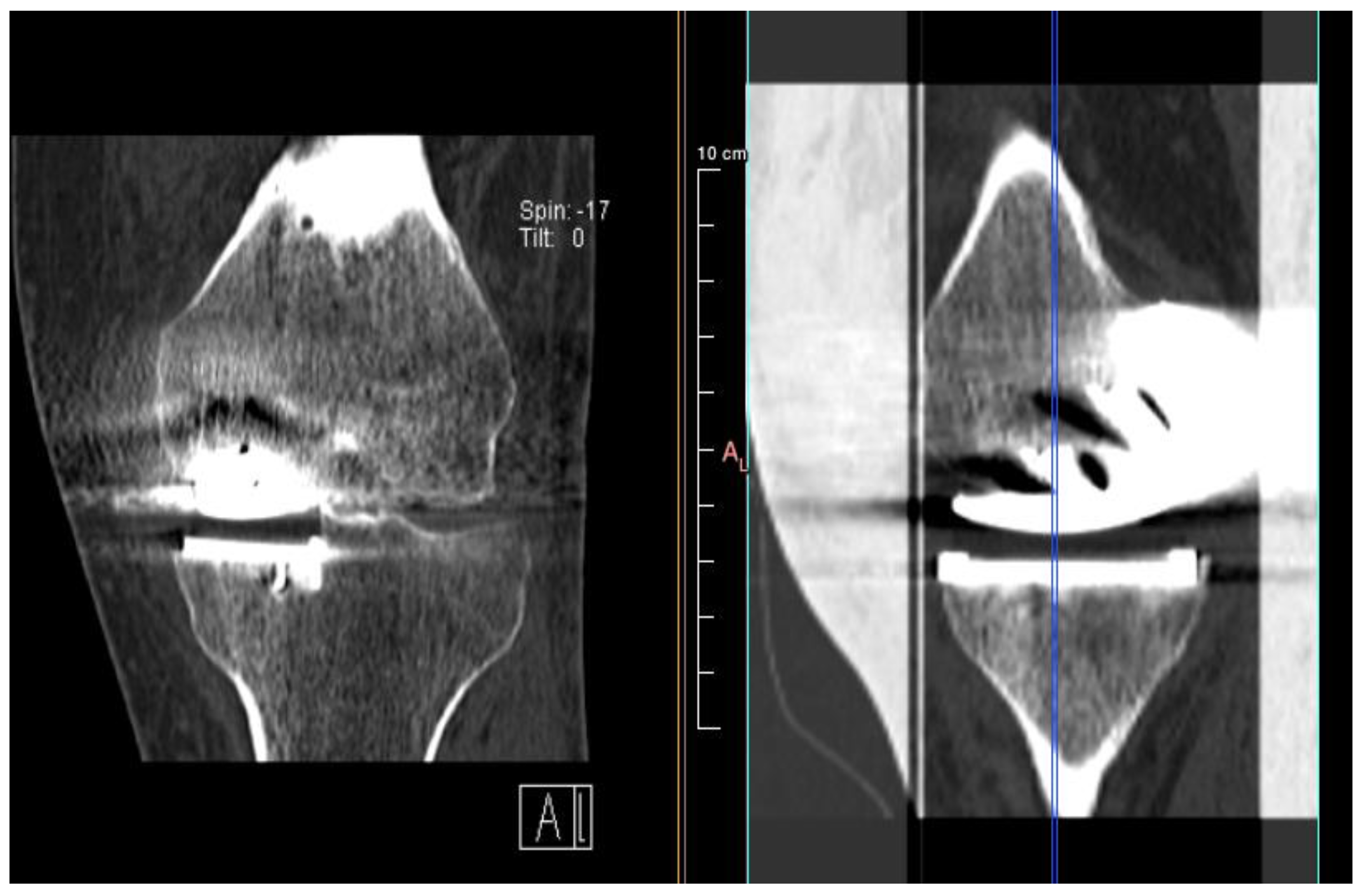 - Khan, O.H.; Davies, H.; Newman, J.H.; Weale, A.E. Radiological changes ten years after St. Georg Sled unicompartmental knee replacement. Knee 2004, 11, 403. [Google Scholar] [CrossRef] [PubMed]