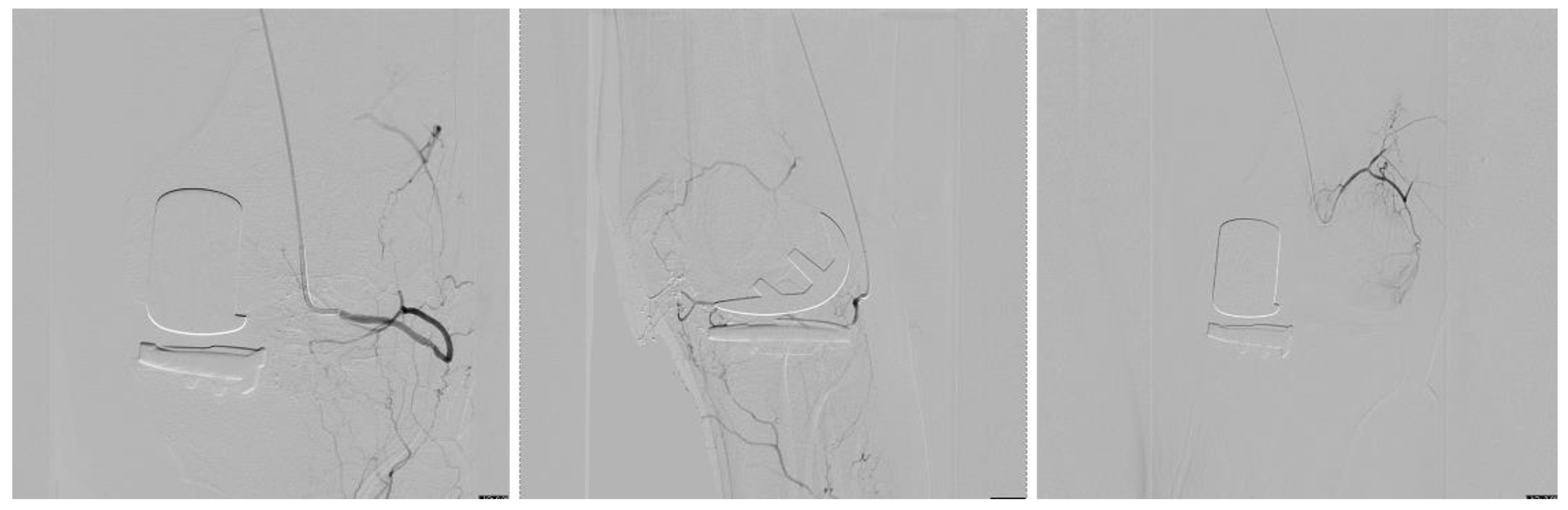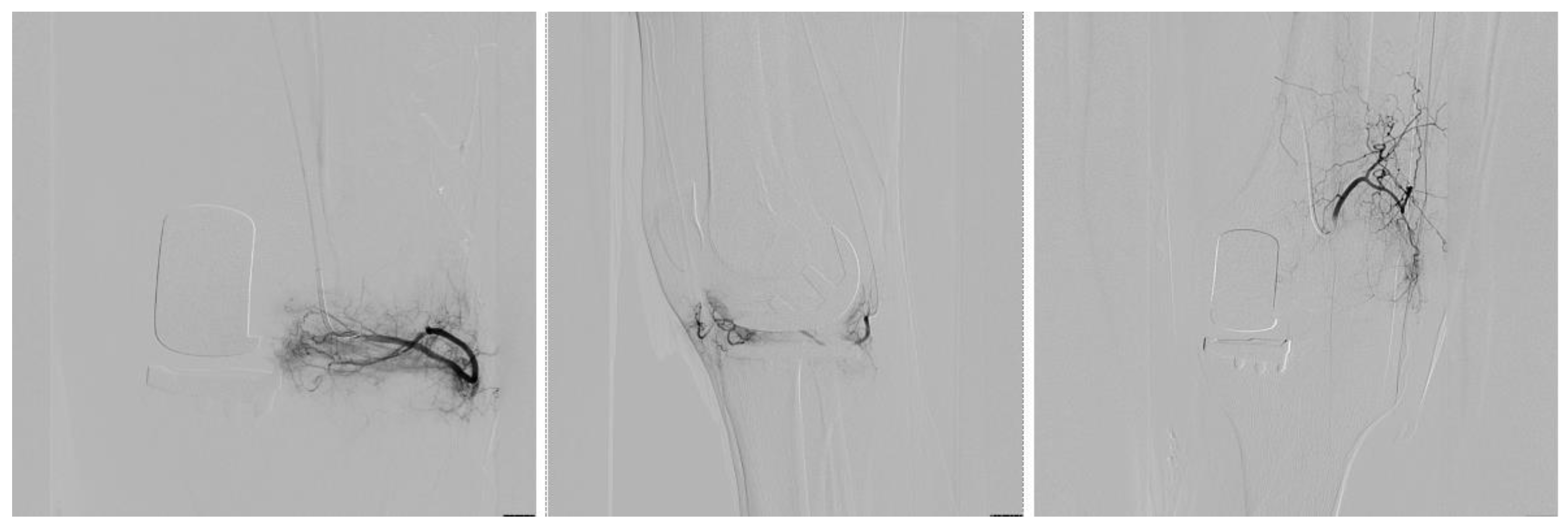 - Chau, Y.; Roux, C.; Gonzalez, J.F.; Breuil, V.; Bernard de Dompsure, R.; Fontas, E.; Rudel, A.; Sédat, J. Effectiveness of Genicular Artery Embolization in Chronic Pain After Total Knee Replacement: A Pilot Study. J. Vasc. Interv. Radiol. 2023, 34, 1725–1733. [Google Scholar] [CrossRef]
