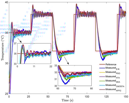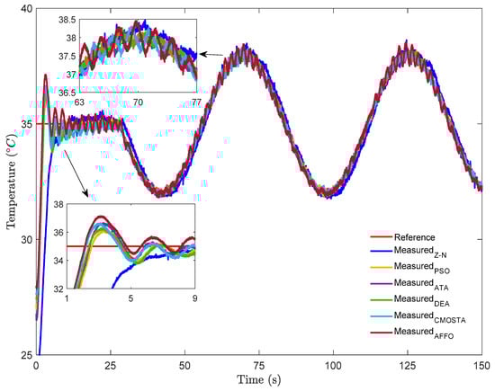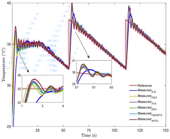 Moreover, the MAE values obtained from the experimental results to analyze the reference temperature tracking performance of all optimization methods are presented in Table 3. For the step part of the reference signal, the DEA method had the lowest MAE value of approximately 0.6188, which shows that it is the optimization method with the highest tracking accuracy. After that, the DEA was followed by AFFO with 0.6291, PSO with 0.6416, CMOSTA with 0.6602, and ATA with 0.6650, respectively. Furthermore, the highest MAE value, 1.3471, was observed for the Z–N method, indicating that it exhibited the worst reference tracking performance for the step part of the reference signal. When analyzing the MAE values for the sinusoidal part of the reference signal, it is seen that all optimization methods had almost the same MAE value, but the method with the lowest MAE value was the DEA, with approximately 0.0901. Further, it was observed that this method was followed by CMOSTA with 0.1011, PSO with 0.1098, ATA with 0.1107, AFFO with 0.1307 and Z–N with 0.2930, respectively. Additionally, it was observed that the DEA achieved the lowest overall MAE value for the entire reference signal, approximately 0.2055, indicating the best tracking performance, while Z–N recorded the highest MAE value, around 0.4898.