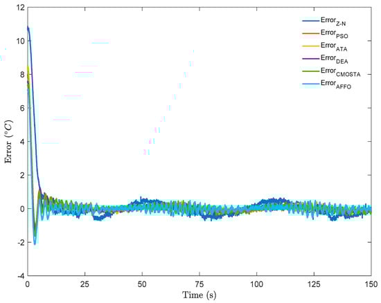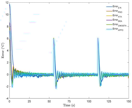 In Figure 3, the error signals for all optimization methods are presented. As can be seen from the figure, the Z–N method exhibited the highest reference tracking error. All methods exhibit a pronounced transient error at the beginning of the experiment, which is expected due to the initial mismatch between the setpoint and the measured temperature and the intrinsic thermal inertia of the heat-flow system. However, clear differences emerge in both the transient attenuation and the steady-state error behavior. The Z–N-tuned controller produced the largest error amplitude and the most persistent deviation from zero, indicating a comparatively less robust tuning for this slow thermal process. This behavior suggests weaker disturbance rejection and a suboptimal balance between response speed and damping, which results in larger excursions during tracking.