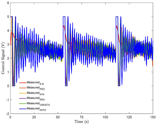 In Figure 4, the control signals of all optimization methods have been depicted. For each method, the amplitude of the control signal applied to the system for temperature tracking was kept within the range of 0–5 V. As illustrated in the figure, the AFFO method produced the highest amplitude and most oscillatory control signal along the reference trajectory compared to the other methods. Although the Z–N method generated the least oscillatory control signal, the control effort produced by the controller parameters obtained with this method was insufficient for effective reference temperature tracking. In contrast, the DEA method, which provided the best temperature tracking performance, produced one of the lowest amplitude control signals, together with CMOSTA.