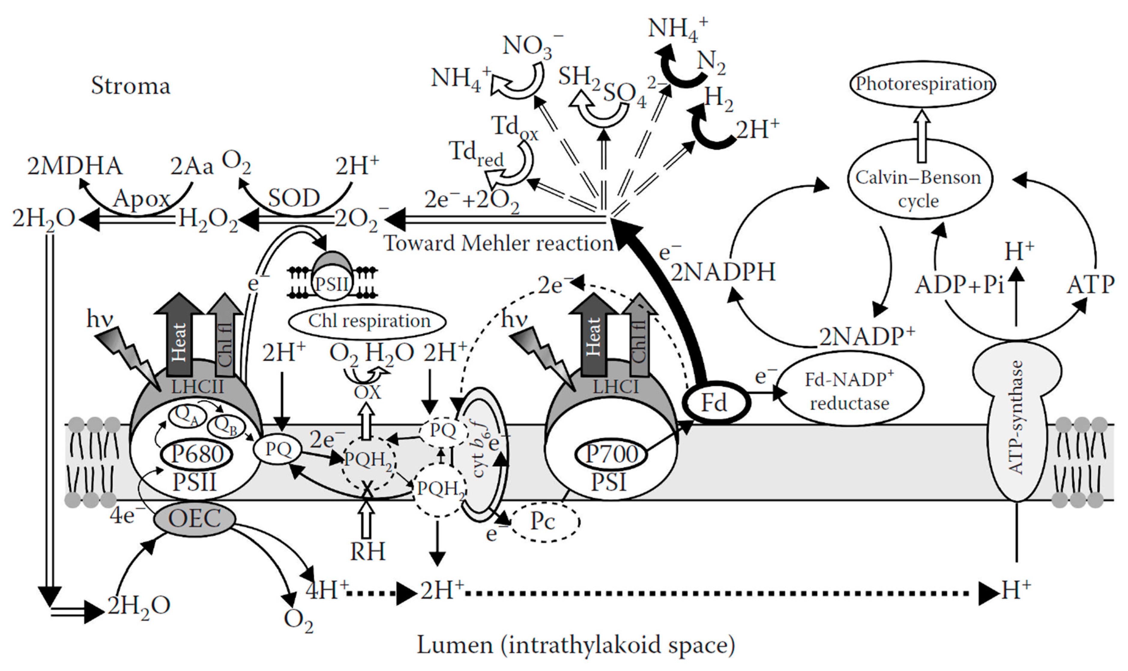 - Redox imbalance: Over-reduction of PQ and the PSI acceptor side promote electron leakage. If PSII is not properly downregulated under environmental stress, ROS are generated either via direct electron transfer from phylloquinone to oxygen (forming O2˙−) or through 1O2 formed from 3P700 at light conditions [83]. The P700 triplets molecule could be formed at charge recombination during reverse reactions [97]. The generated ROS can subsequently react with Fe-S clusters to produce OH˙.