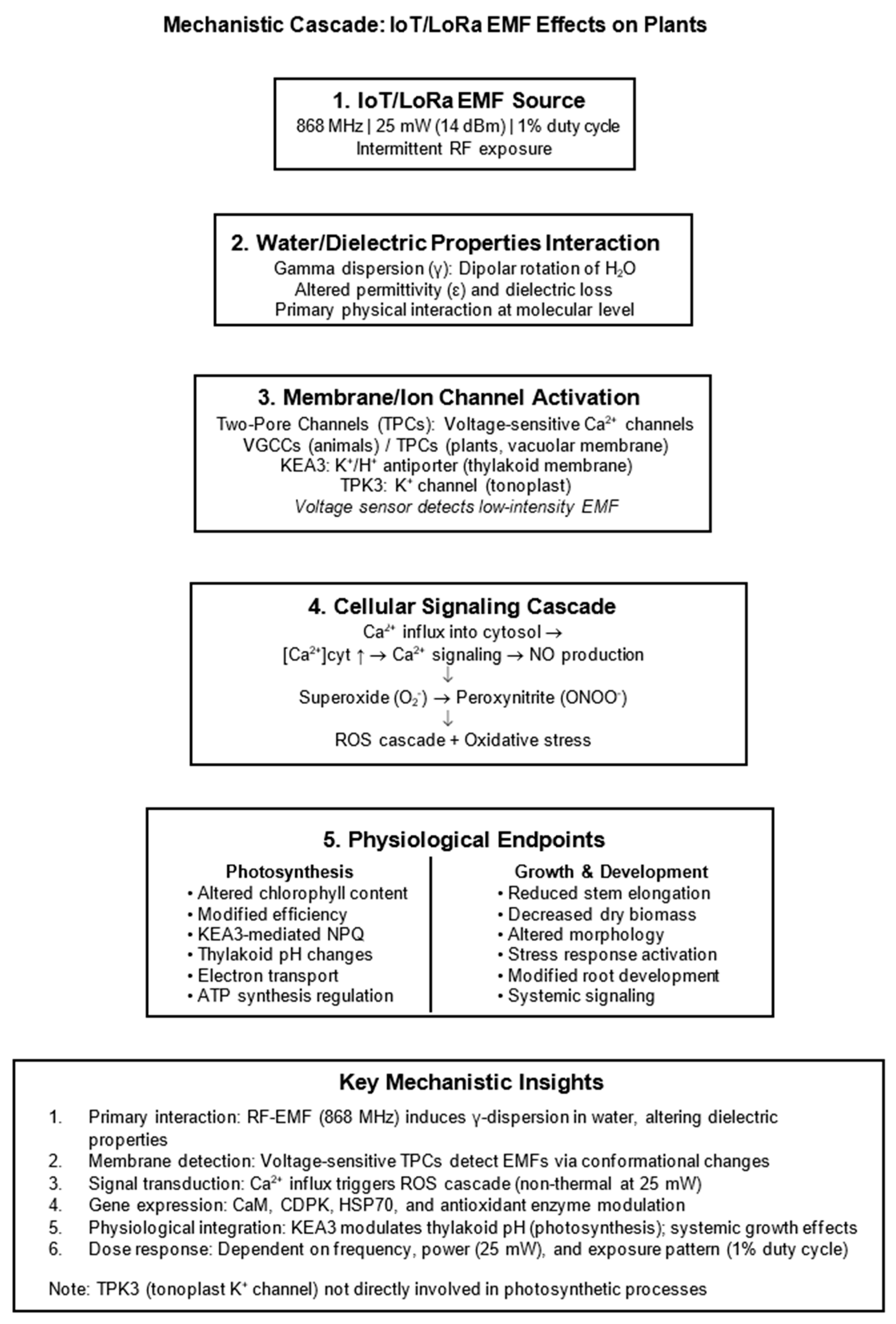 - Ion homeostasis: EMFs can activate voltage-gated calcium channels or affect ion transporters (e.g., TPK3 and KEA3), altering calcium and potassium fluxes across the thylakoid membrane. This disrupts ΔpH and Δψ, affecting ATP synthase and NPQ regulation. For example, calcium signaling may enhance NADPH oxidase/respiratory burst oxidase homolog activity, increasing O2− production in the apoplast and indirectly affecting thylakoid function [96].