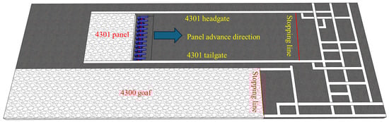 The 4301 panel is designed to extract the No. 4-2 coal seam. This seam has an average burial depth of 800 m and a mean thickness of 8.50 m, classifying it as an ultra-thick coal seam. The minable panel dimensions include a strike length of 2940 m and a dip length of 300 m. The seam inclination ranges from 2° to 6°, with an average of approximately 3°. Structurally, the coal seam exhibits a banded texture and layered formation, characterized by medium hardness, brittle behavior, and well-developed joint systems. It contains 1 to 3 partings, with individual thicknesses ranging from 0.20 m to 0.60 m (locally reaching 1.6 m), averaging 0.60 m. The layout of the 4301 panel is presented in Figure 1.