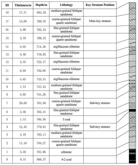 The intensity and distribution pattern of stope strata behavior are essentially determined by the structural fracture characteristics and movement state of the key strata in the overlying rock mass. Different fracture characteristics of the primary and secondary controlling key strata directly lead to distinct stope strata pressure response features [26,27]. Therefore, it is necessary to conduct a specific analysis from the perspective of identifying the primary and secondary controlling rock strata for intense strata behavior, combined with the surface borehole columnar section of the 4301 panel in the 4-2 coal seam of the coal mine. Based on the Key Stratum Theory proposed by Academician Qian Minggao [28], a systematic identification of the key stratum positions in the overlying rock mass of this working face was carried out. This provides a fundamental basis for the subsequent analysis of the influence of rock stratum fracture on strata pressure. The conditions of the overlying rock mass and the identification results of interlayer key strata in the 4301 panel are illustrated in Figure 2.