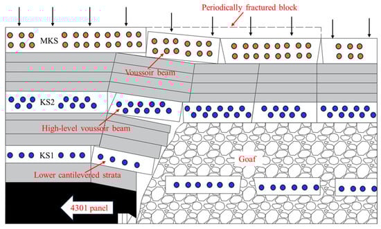 Based on Formula (4), the fracture-induced structural configurations of the overlying key strata at the 4301 panel were evaluated. The results indicate that the sub-key stratum KS1 forms a “cantilever beam” structure after fracture, while both the sub-key stratum KS2 and the main key stratum (MKS) develop “voussoir beam” structures post-fracture. A schematic model illustrating the fracture patterns and structural configurations of the overburden key strata is presented in Figure 3.