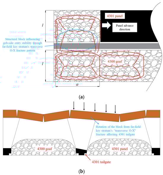 Schematic diagram of the governing key stratum’s role in the transverse O-X fracture at 4301 tailgate: (a) plan view; (b) sectional view.