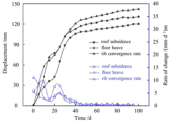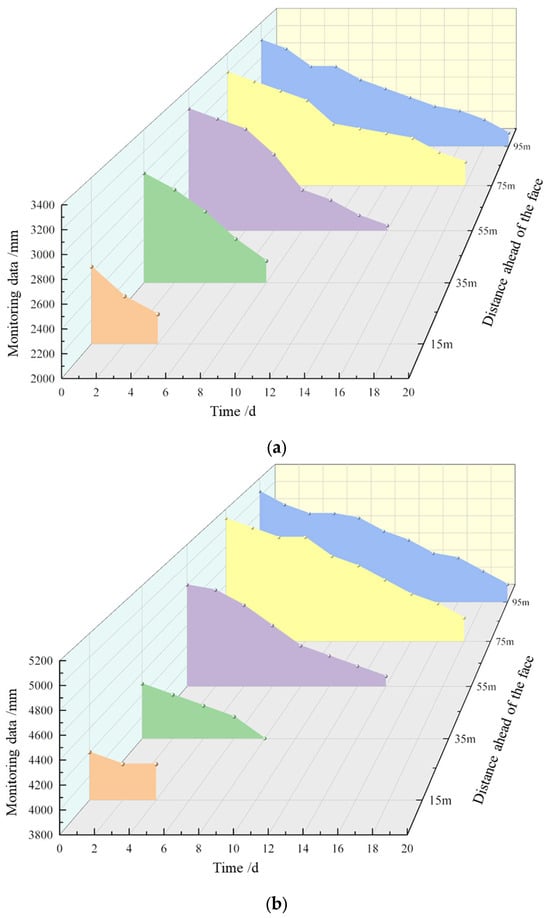 Field monitoring data of the surrounding rock in the 4301 tailgate are presented in Figure 8.