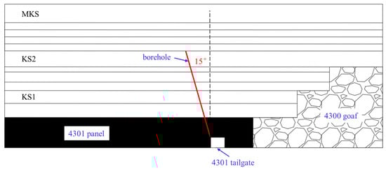 Based on this, combined with the geological conditions of the 4301 panel, the cross-sectional dimensions of the 4301 tailgate, the roof cutting engineering volume, and the rock mechanical parameters, a targeted roof-cutting pressure-relief technical scheme for the 4301 tailgate was developed. Specifically, in the 4301 tailgate, 50 m or more ahead of the 4301 panel and perpendicular to the coal rib, directional long-borehole hydraulic fracturing technology was adopted. Boreholes were drilled obliquely upward at a 15° elevation angle toward the 4301 panel, with a borehole spacing of 50 m and a roof cutting height of 58 m, as shown in Figure 9.