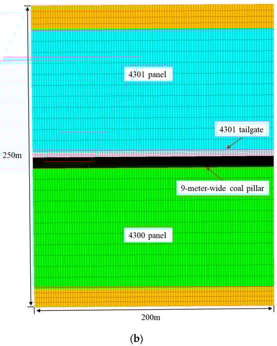 To analyze the fracture types of each key stratum in the overlying rock strata of the 4301 panel, a numerical model was established based on the actual geological conditions and roadway layout of the 4301 panel. A numerical calculation model was constructed using FLAC3D, as shown in Figure 10, with dimensions of 250 m (length) × 200 m (width) × 190 m (height). The 4301 tailgate was arranged with dimensions of 5.0 m × 3.5 m, containing a total of 2,230,400 elements and 2,454,010 nodes. The displacement of the model’s bottom surface and the four side surfaces (front, rear, left, and right) was fixed. A vertical stress of 16.25 MPa was applied to the top of the model, with a lateral pressure coefficient of 1.0.
