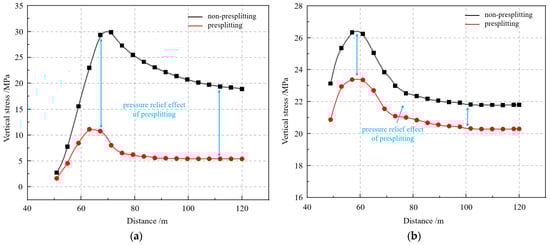 Vertical stress curves with and without presplitting: (a) solid coal rib; (b) coal pillar rib.