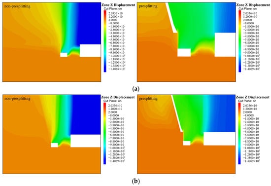 Vertical displacement contours in the advanced section of the 4301 tailgate before and after presplitting (unit/mm): (a) advance 50 m; (b) advance 150 m.