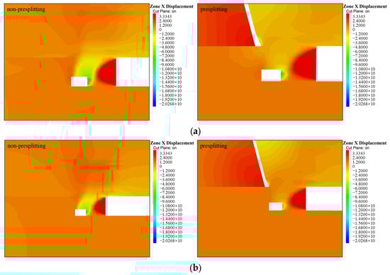 To investigate the evolution of surrounding rock stability before and after pressure relief, numerical models with and without roof cutting were established [35]. By examining the distribution patterns of displacement and vertical stress evolution in the surrounding rock, this study further elucidates the mechanistic role of roof cutting in maintaining roadway stability.