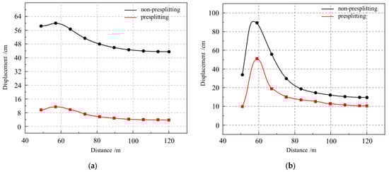 A comparative analysis of the vertical and horizontal displacement patterns in the 4301 tailgate was conducted before and after pressure relief. The vertical and horizontal displacements at 50 m and 150 m within the advanced section of the 4301 tailgate under both simulation schemes are presented in Figure 13, Figure 14 and Figure 15.