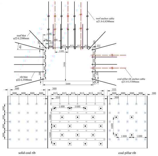 (4) Coal pillar rib bolt support: Threaded steel bolts with a diameter of Φ22 mm and length of 3500 mm are adopted, with a spacing and row distance of 800 mm × 850 mm. They are equipped with 200 mm × 200 mm × 10 mm iron bearing plates. 8# diamond-shaped wire mesh with dimensions of 1000 mm × 3600 mm is hung on the rib.