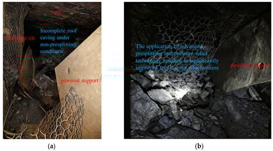 Field observations of roof caving conditions at the face area before and after presplitting: (a) non-presplitting; (b) presplitting.