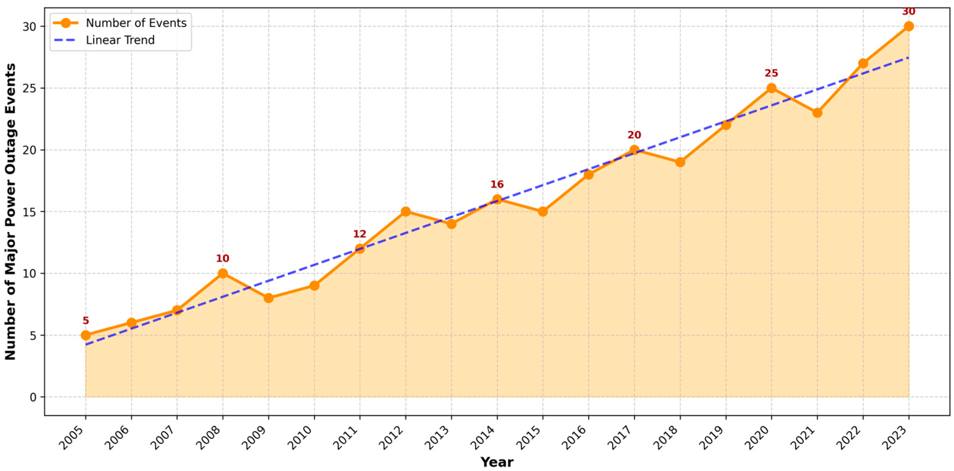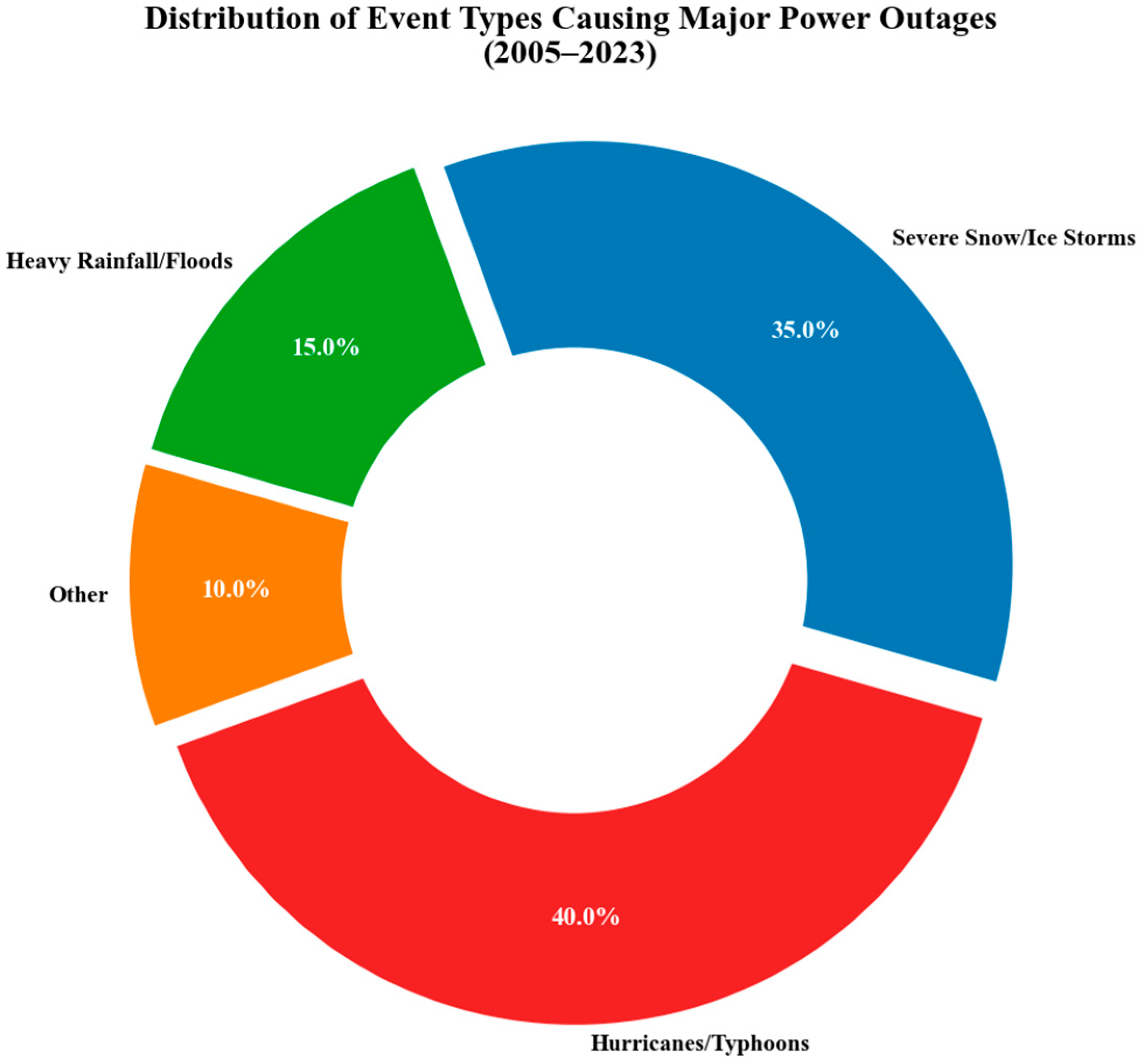 - Impact Threshold: A specific impact magnitude criterion was applied to the case studies. The primary objective is to focus on ‘High-Impact’ events. Therefore, only incidents affecting more than 100,000 customers were included in the study. Alternatively, events causing economic losses exceeding USD 10 million were also selected.