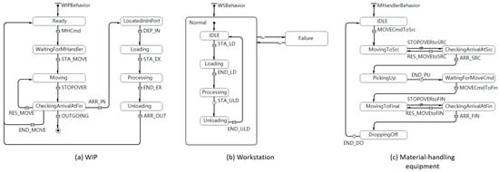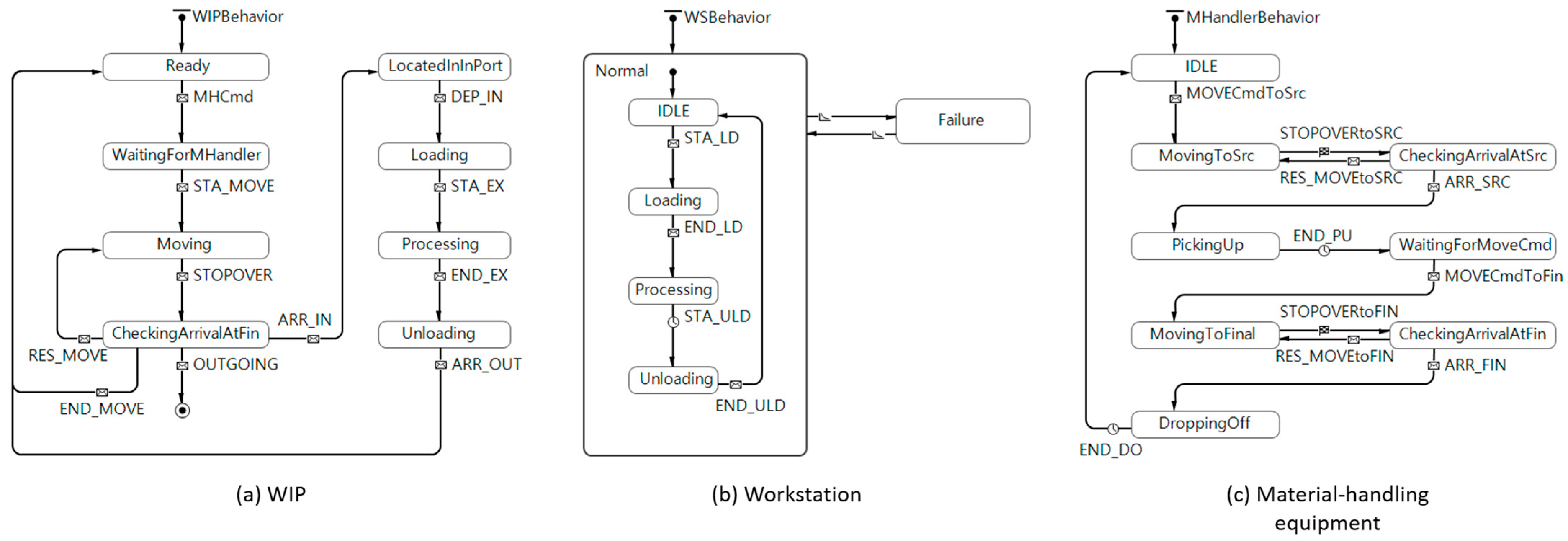 - MHEC (material-handling equipment controller): It simulates the behavior of material-handling equipment and reports status changes to the MES. Each MHEC is typically linked in a one-to-one manner with an MHAgent, receives control commands from the associated MHAgent and reports on the execution results. It specifically handles WIP transportation, thereby inducing changes in WIP status.