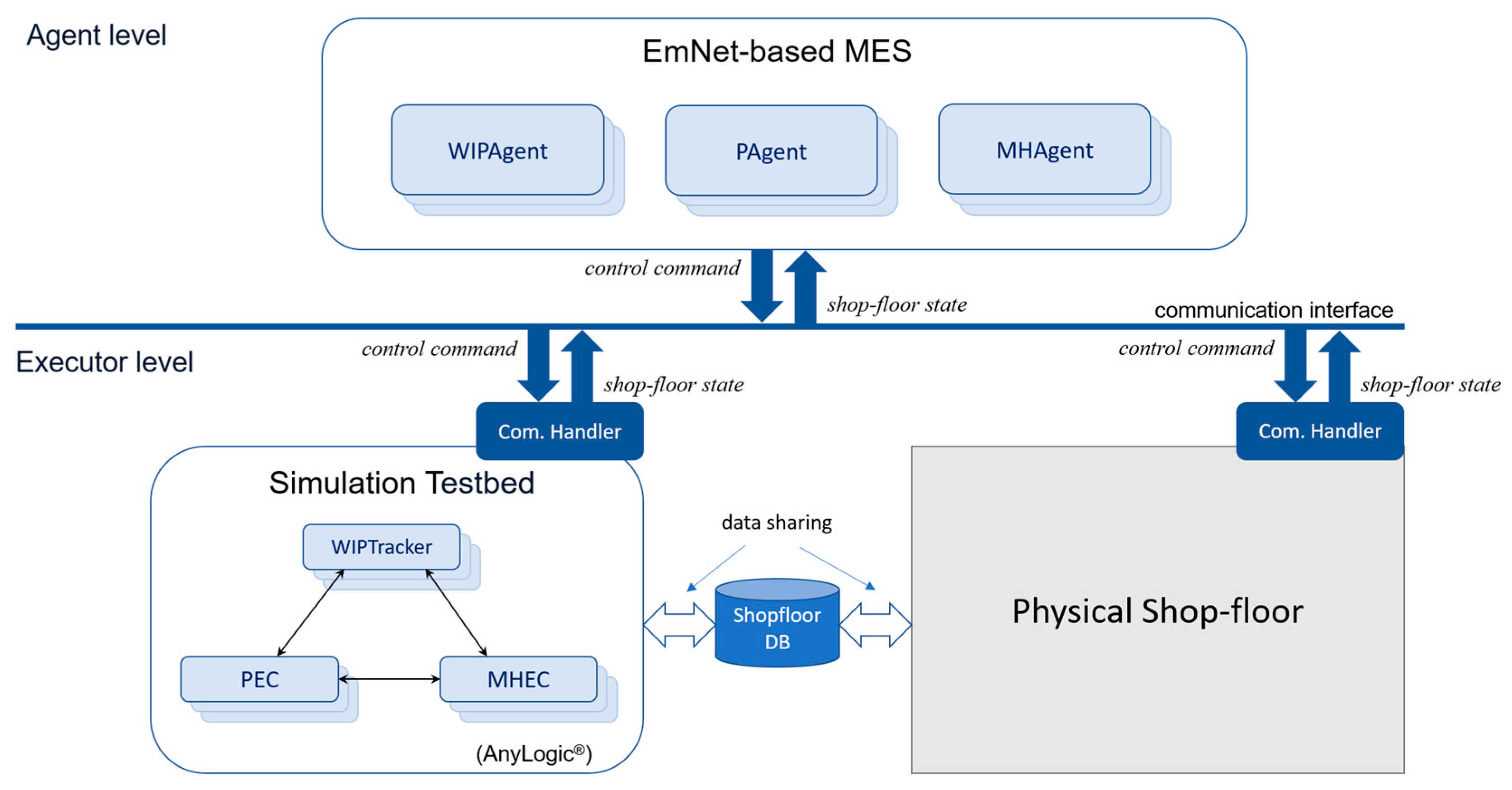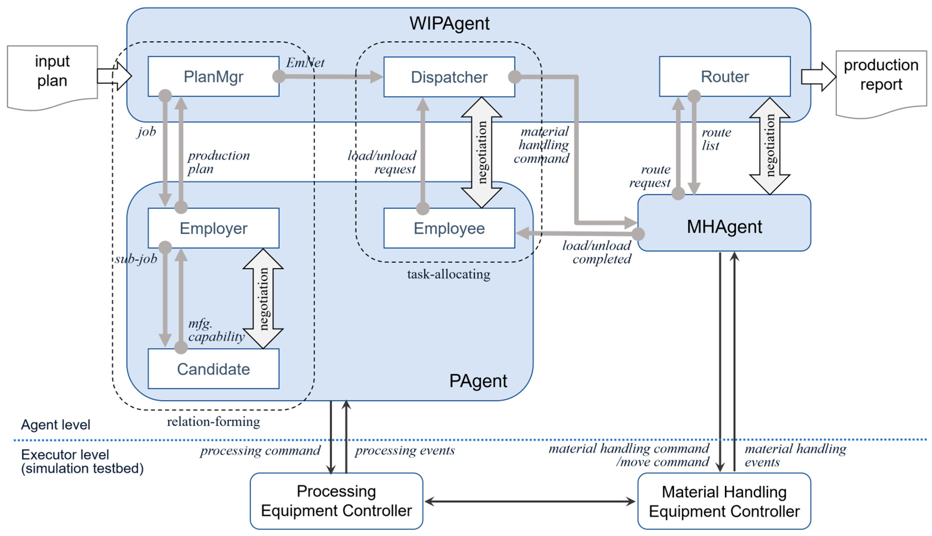 - PEC (processing equipment controller): It simulates the behavior of processing workstations and reports status changes of individual workstations to the MES. Each PEC is typically linked one-to-one with a PAgent, receives control commands from the associated PAgent and reports on the execution results. It also interacts with WIPTrackers to induce changes in WIP processing status.