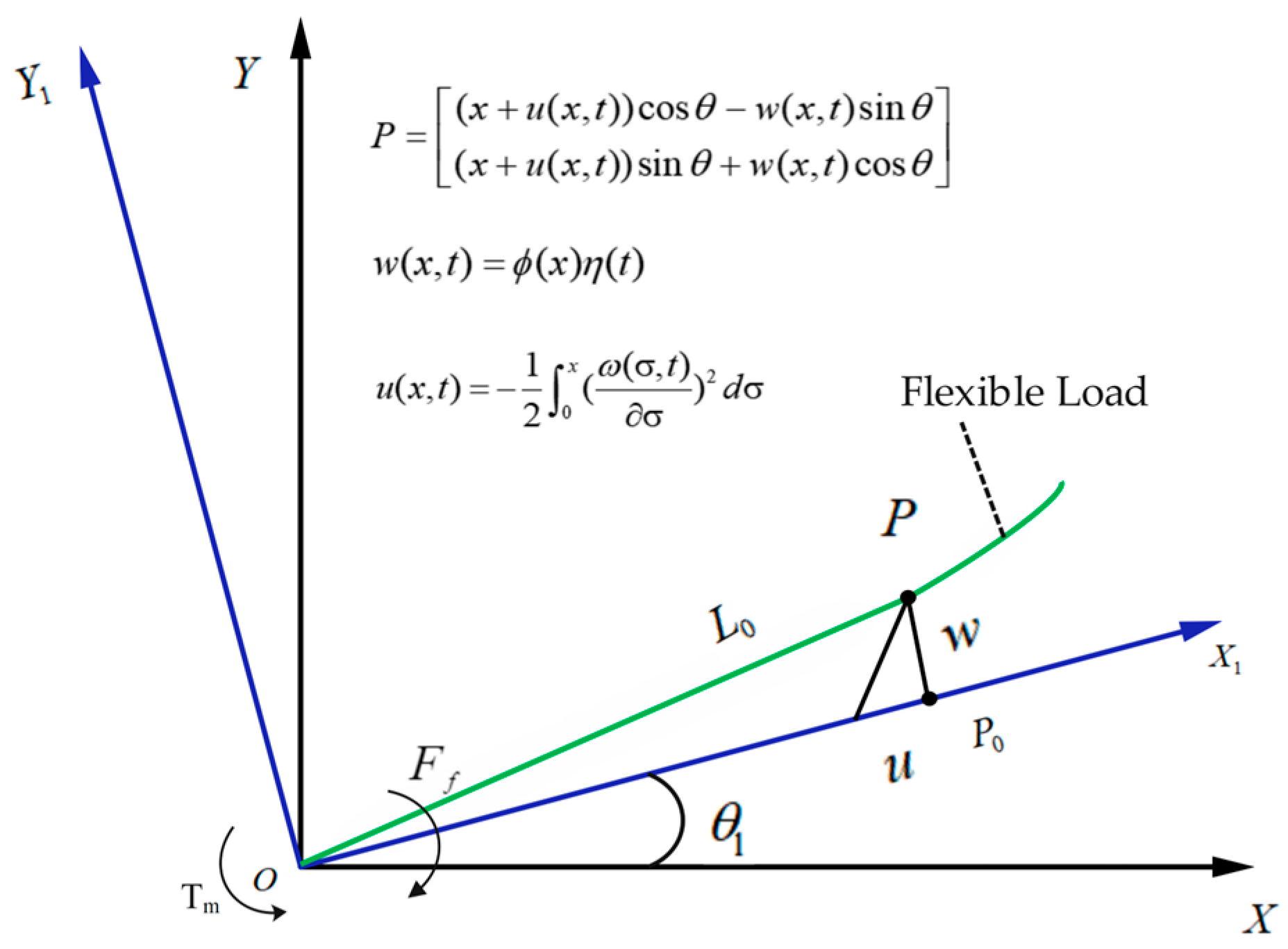 Throughout this paper, the terms “flexible manipulator” and “flexible load” refer to distinct but related concepts within the studied servo system. The flexible manipulator denotes the entire mechanical structure, which comprises a servo motor, a flexible joint, and a driven link that exhibits significant compliance. The flexible load specifically refers to that compliant driven link (modeled as a Euler–Bernoulli beam model) which is connected to the motor via the flexible joint and undergoes two-dimensional deformation during operation. Thus, the flexible load is a key component of the flexible manipulator system, and its dynamics are the primary focus of the modeling and control design presented in this work.