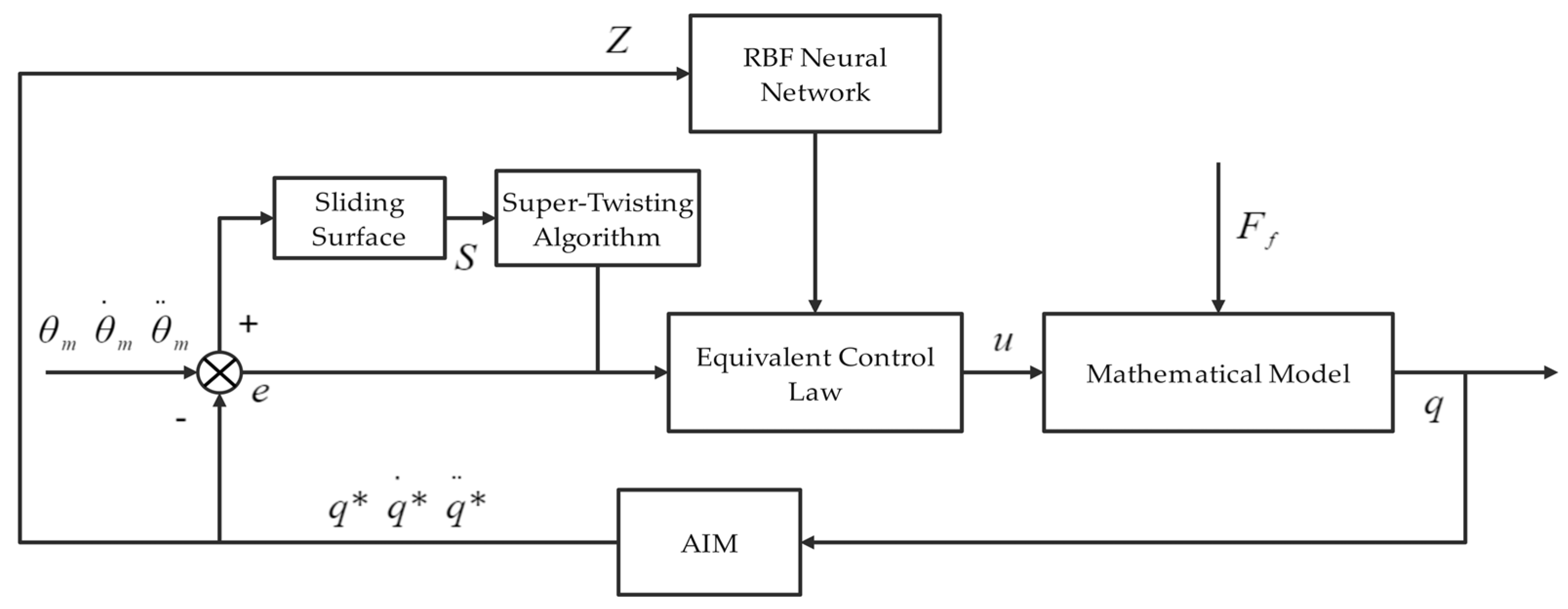 14]. Specifically, the super-twisting algorithm (STA)—an HOSM method—is applied to the flexible manipulator servo system. The super-twisting algorithm sliding mode control (STASMC) inherently suppresses chattering structurally while maintaining robustness against parameter variations and uncertainties. Furthermore, this is coupled with an RBF neural network that provides the real-time approximation of the system’s nonlinear and time-varying components. Together, they form a dual-enhancement mechanism characterized by “high-order chattering suppression + uncertainty compensation”. The proposed method theoretically guarantees finite-time convergence and enhanced stability, with its effectiveness being validated through simulation experiments.
