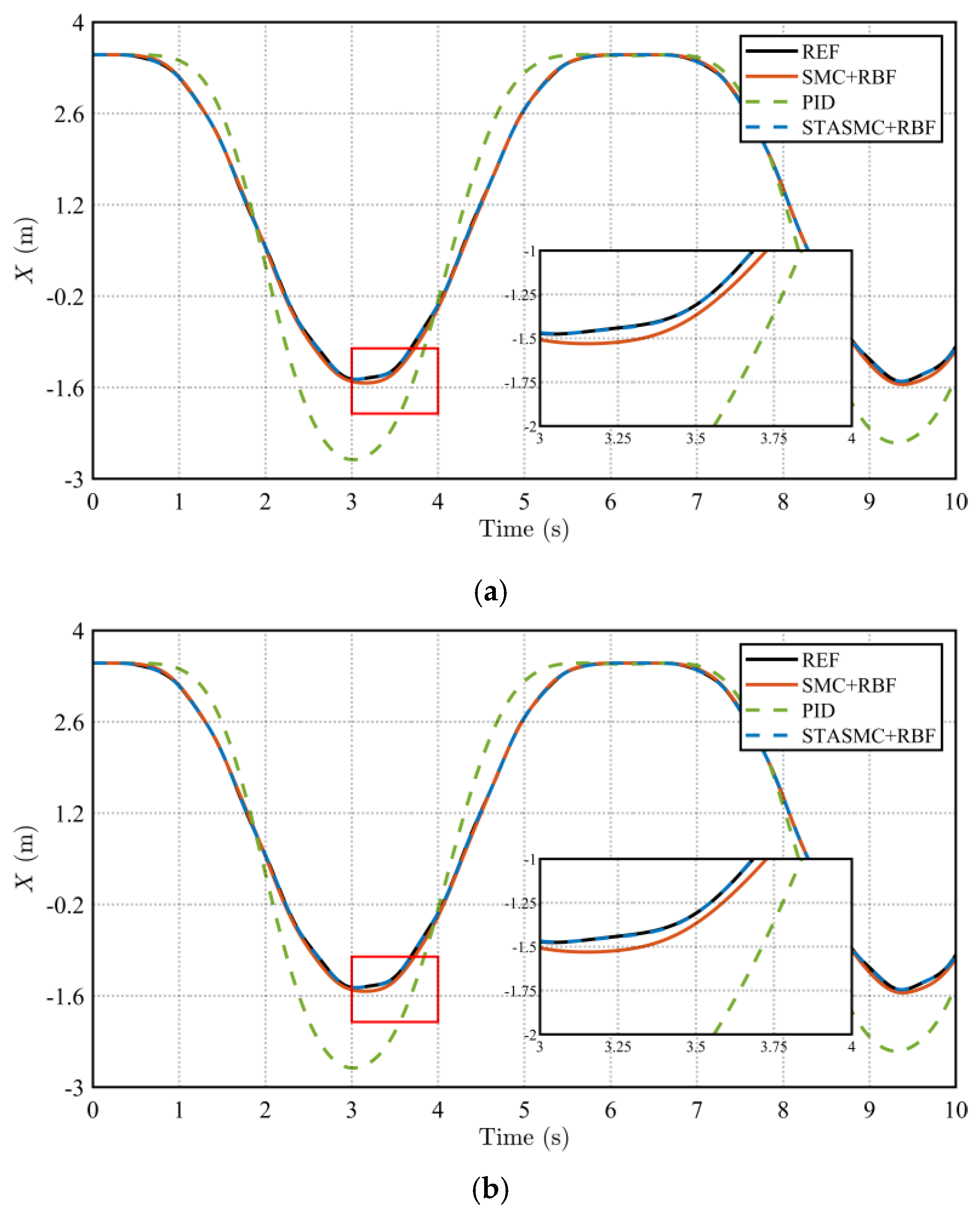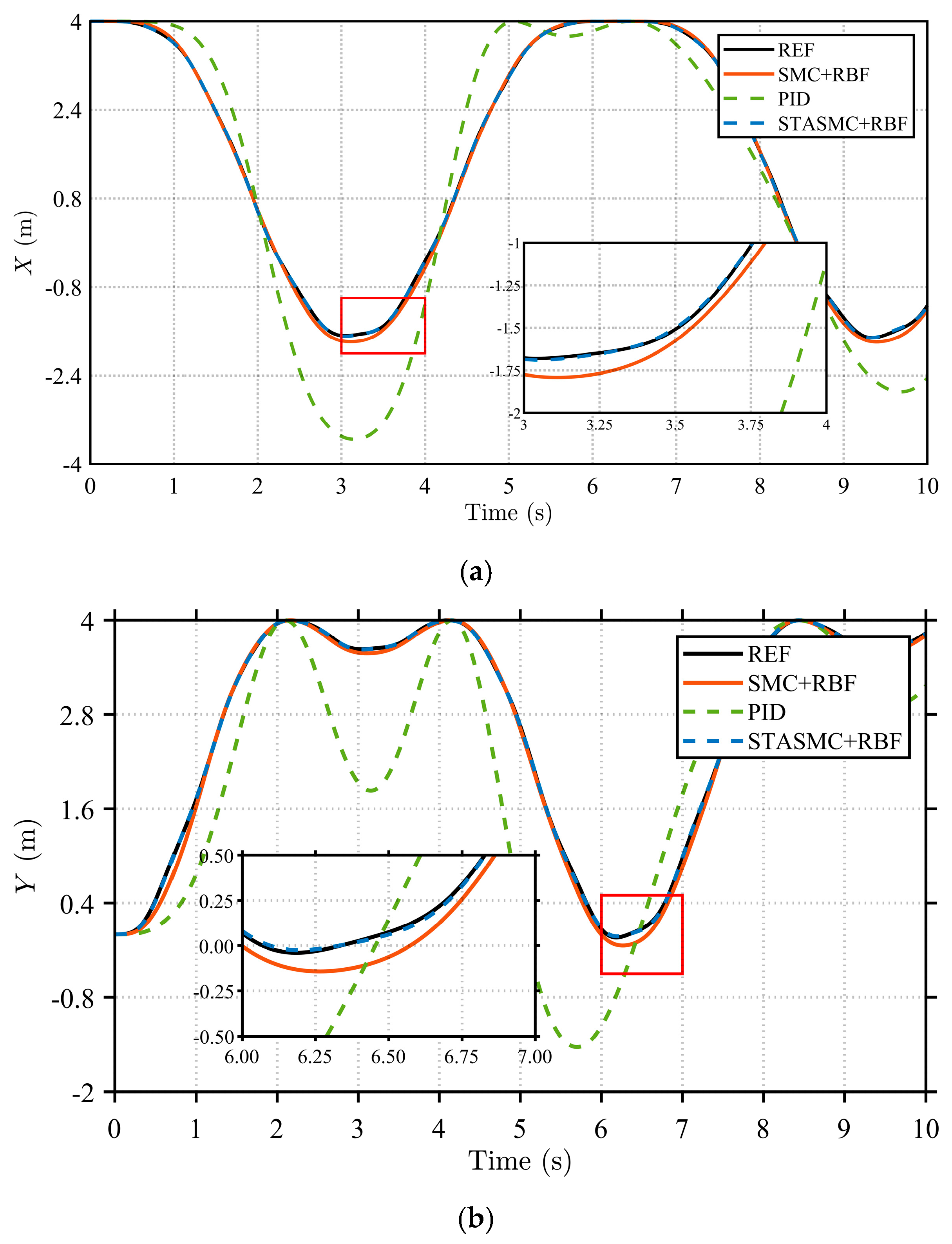 Figure 4, REF represents the desired trajectory. A comparison of the simulation results reveals clear discrepancies between the desired trajectory and the actual tracking trajectories under different control strategies. The PID control exhibits sustained and significant deviations in both the X and Y axis directions, with its trajectory consistently failing to align closely with the desired path. This reflects the inherent limitations of PID in handling complex nonlinear systems and disturbances. In contrast, the SMC strategy improves tracking performance to some extent; however, its deviation increases further during turning and acceleration phases. The STASMC + RBF strategy demonstrates superior trajectory tracking performance. Overall, the path tracked by STASMC + RBF almost coincides with the desired trajectory, showing no noticeable lag. Further observation of the local magnified view confirms that STASMC + RBF achieves precise tracking in both the X and Y axis directions without significant oscillation or deviation at turns. By comparison, the trajectory under SMC exhibits continuous minor deviations and jitter, indicating the inferior convergence of the sliding surface and disturbance rejection capability relative to the STASMC + RBF structure. As shown in