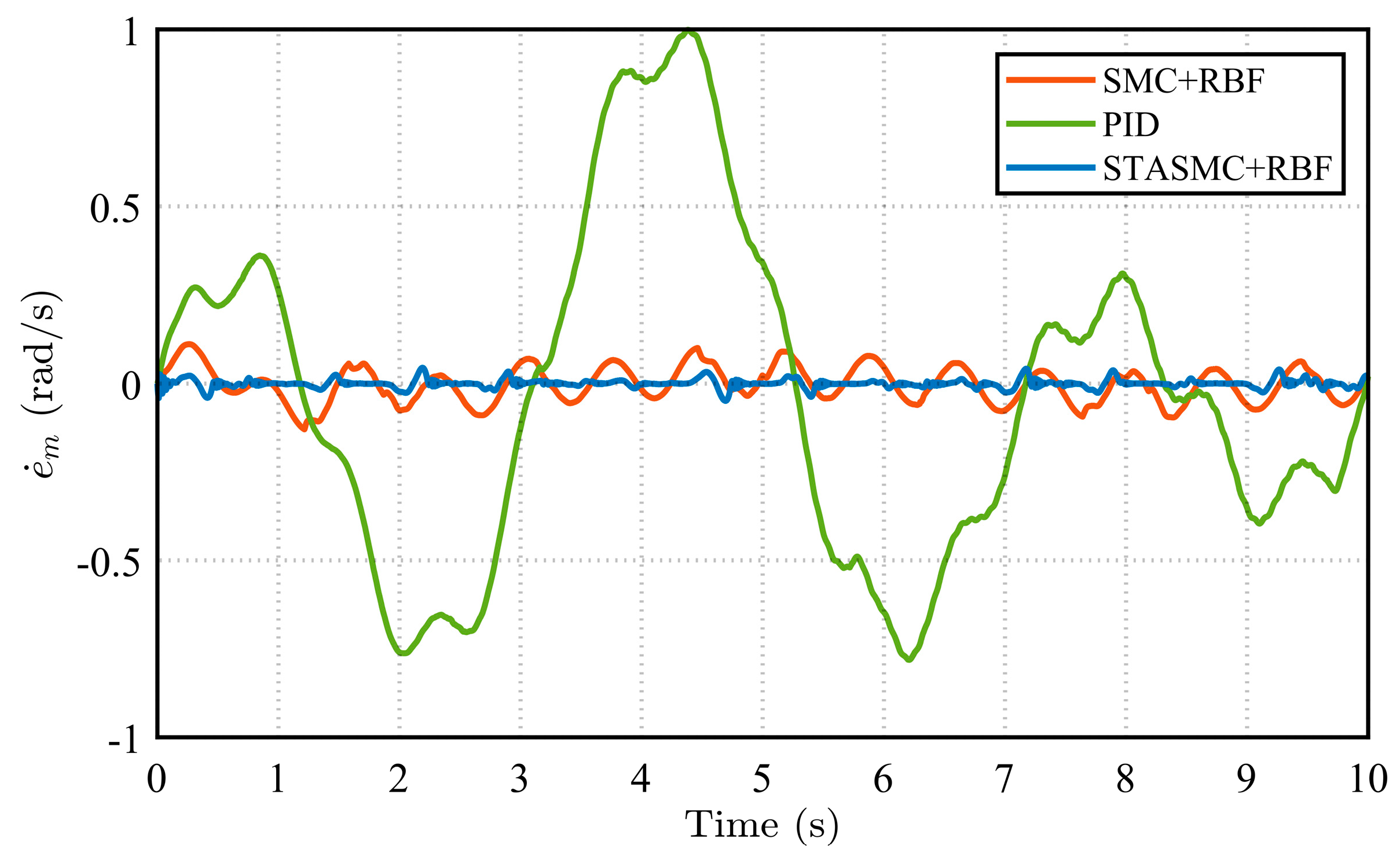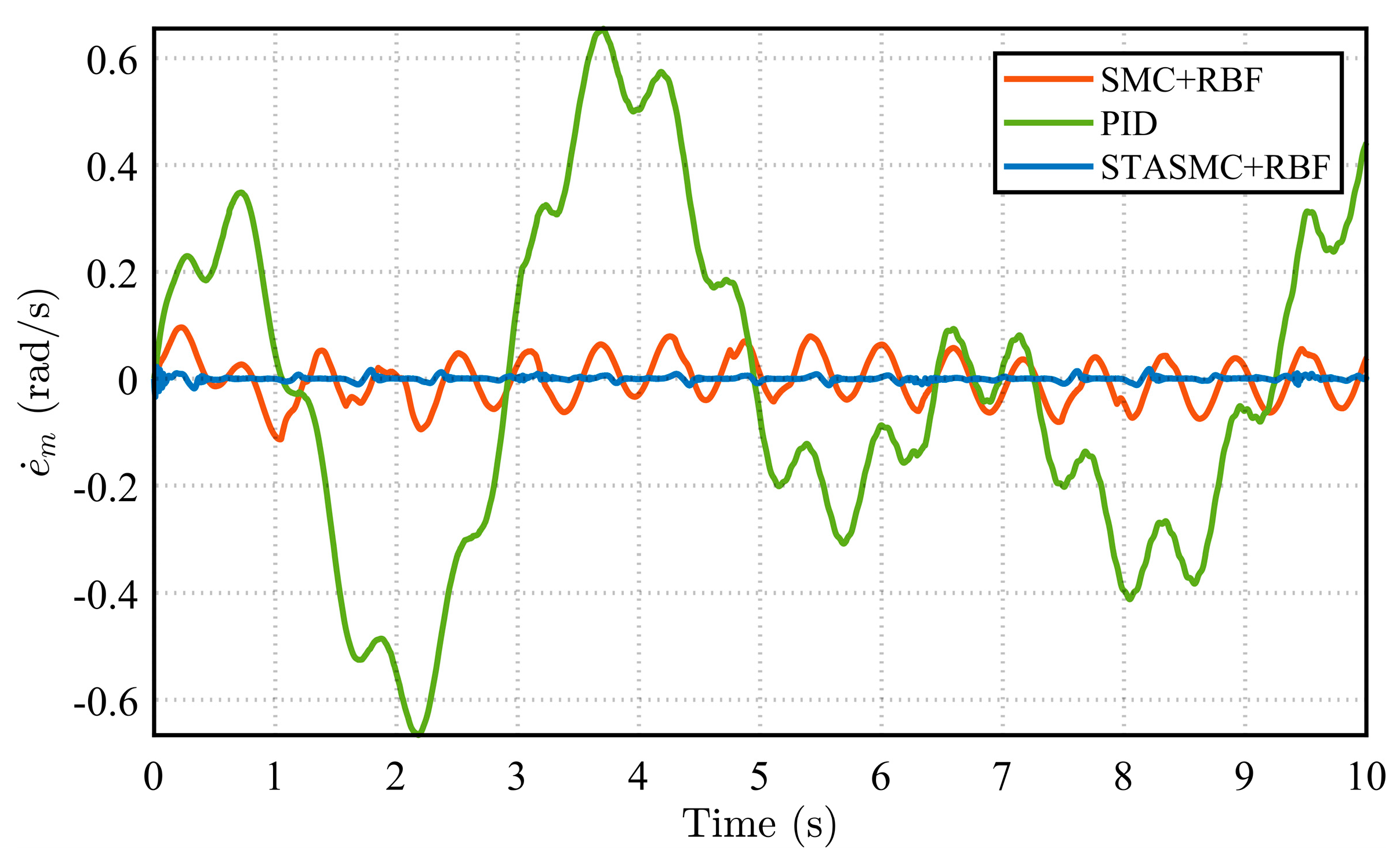 Table 1. For the PID controller, the parameters were set as follows: proportional gain = 15, integral gain = 20, derivative gain = 5, and filter coefficient = 100. For the SMC with an RBF neural network, a conventional sliding surface was adopted, with its coefficient set to 0.5.