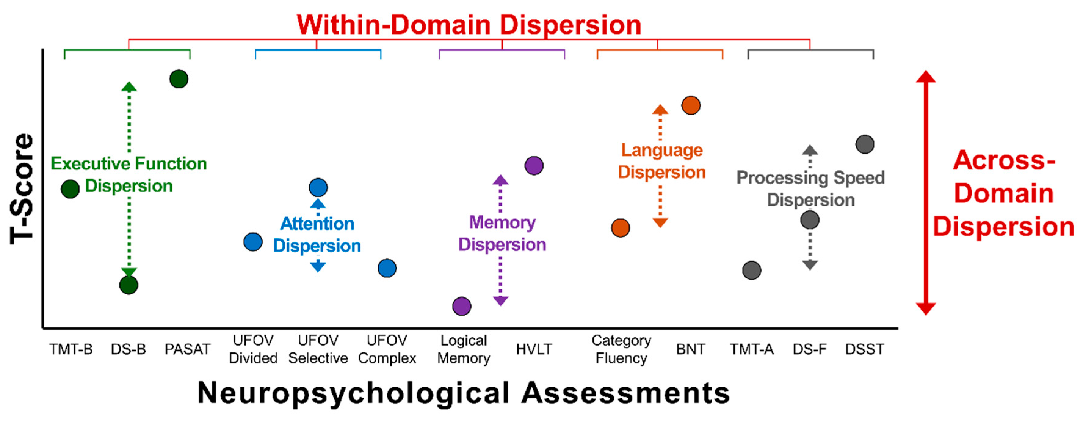 - Fellows, R.P.; Schmitter-Edgecombe, M. Between-Domain Cognitive Dispersion and Functional Abilities in Older Adults. J. Clin. Exp. Neuropsychol. 2015, 37, 1013–1023. [Google Scholar] [CrossRef] [PubMed]