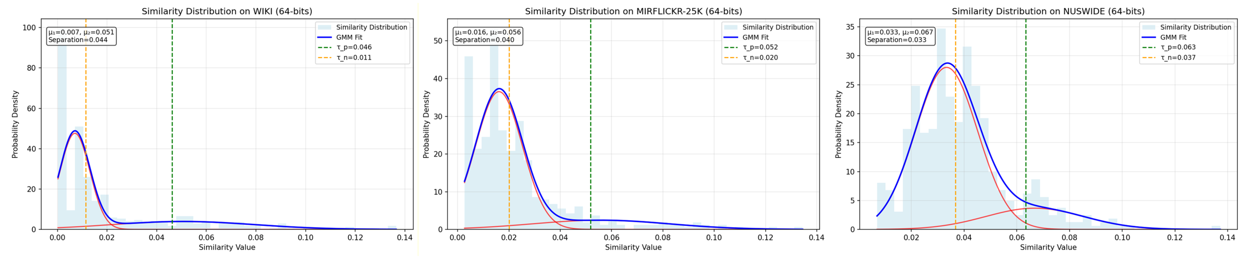 - We propose a hash contrastive learning module that establishes thresholds for positive and negative samples using GMM, providing more stable and distinguishable training signals for the entire model. This significantly enhances the semantic cohesion of the hash codes and improves retrieval accuracy.