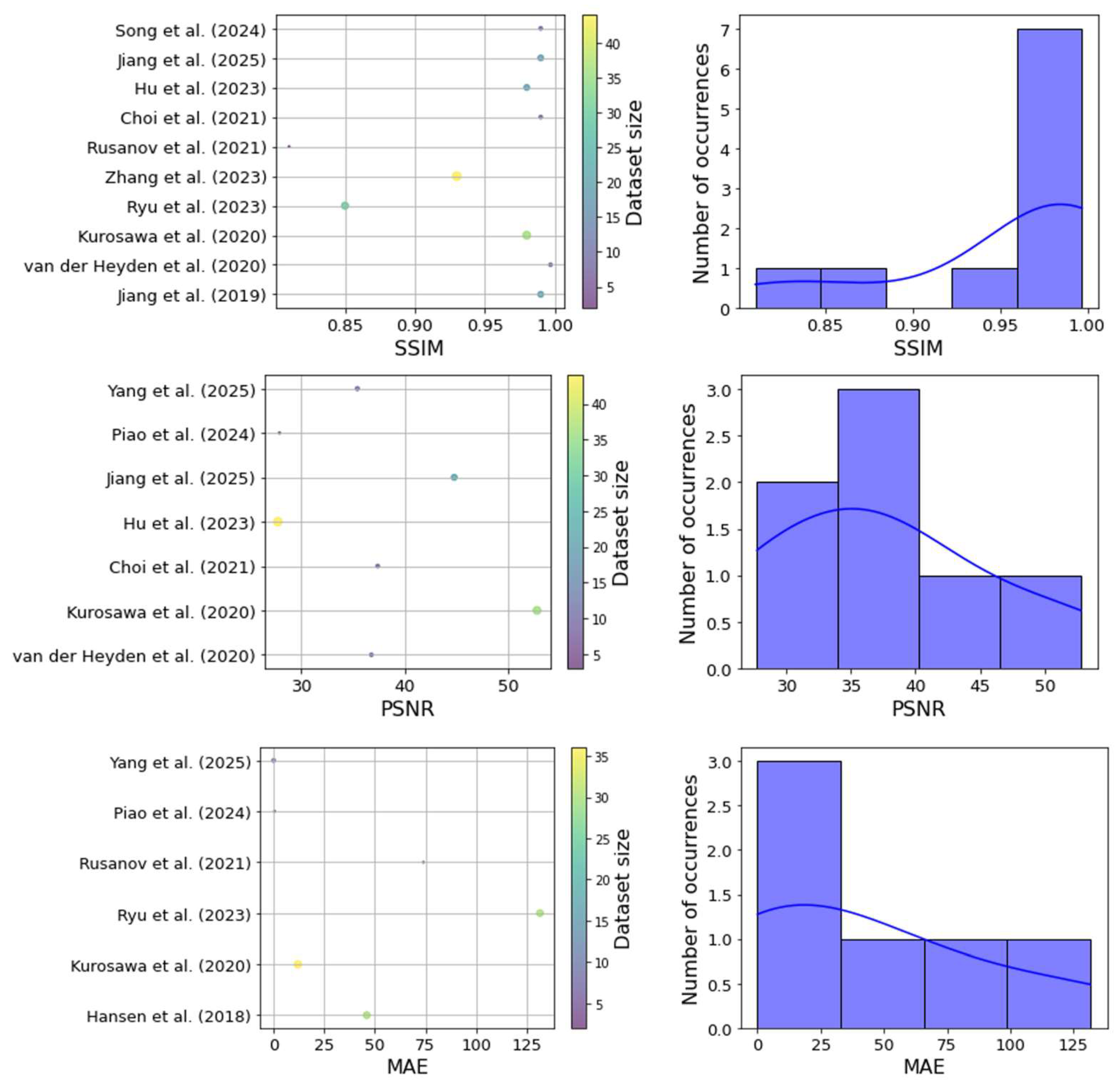 | No. | Authors | Year | Aim | Main Task | Anatomic Region | AI Model | AI Model Availability | Dataset Availability | Dataset Size | Dataset Splitting | Simulated Data | Data Augmentation | Qualitative Metrics | Quantitative Metrics | Main Quantitative Outcomes |