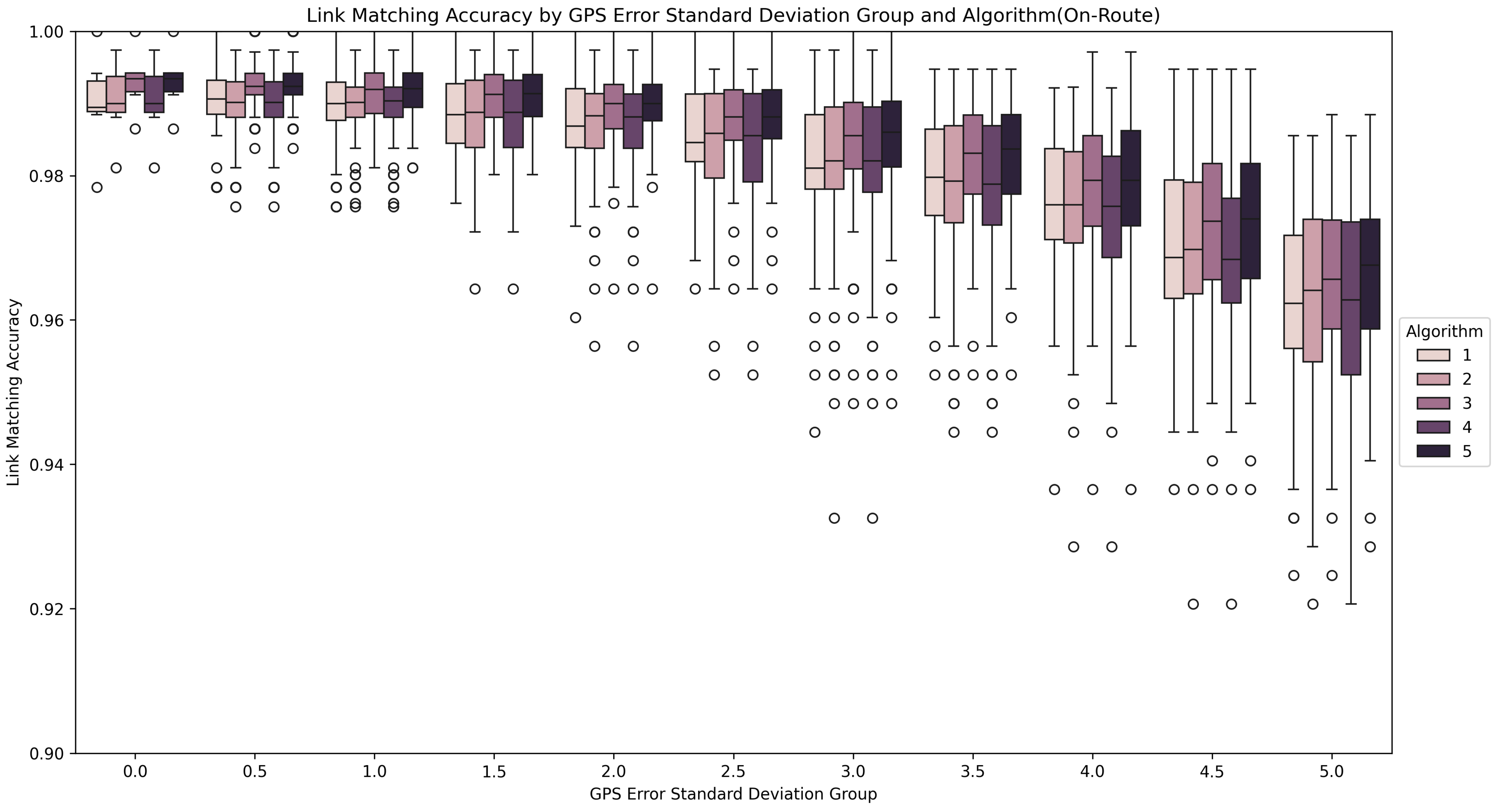 Table 2 present the link matching accuracies for the five algorithms across the defined GPS error groups. Across all conditions, the accuracy values of every algorithm remained above 0.96, indicating reliable spatial association even under increased positional uncertainty. As GPS noise intensified from Group 1 to Group 11, accuracies gradually declined and slight increases in variance were observed, yet the overall stability of all methods remained high throughout the tests.