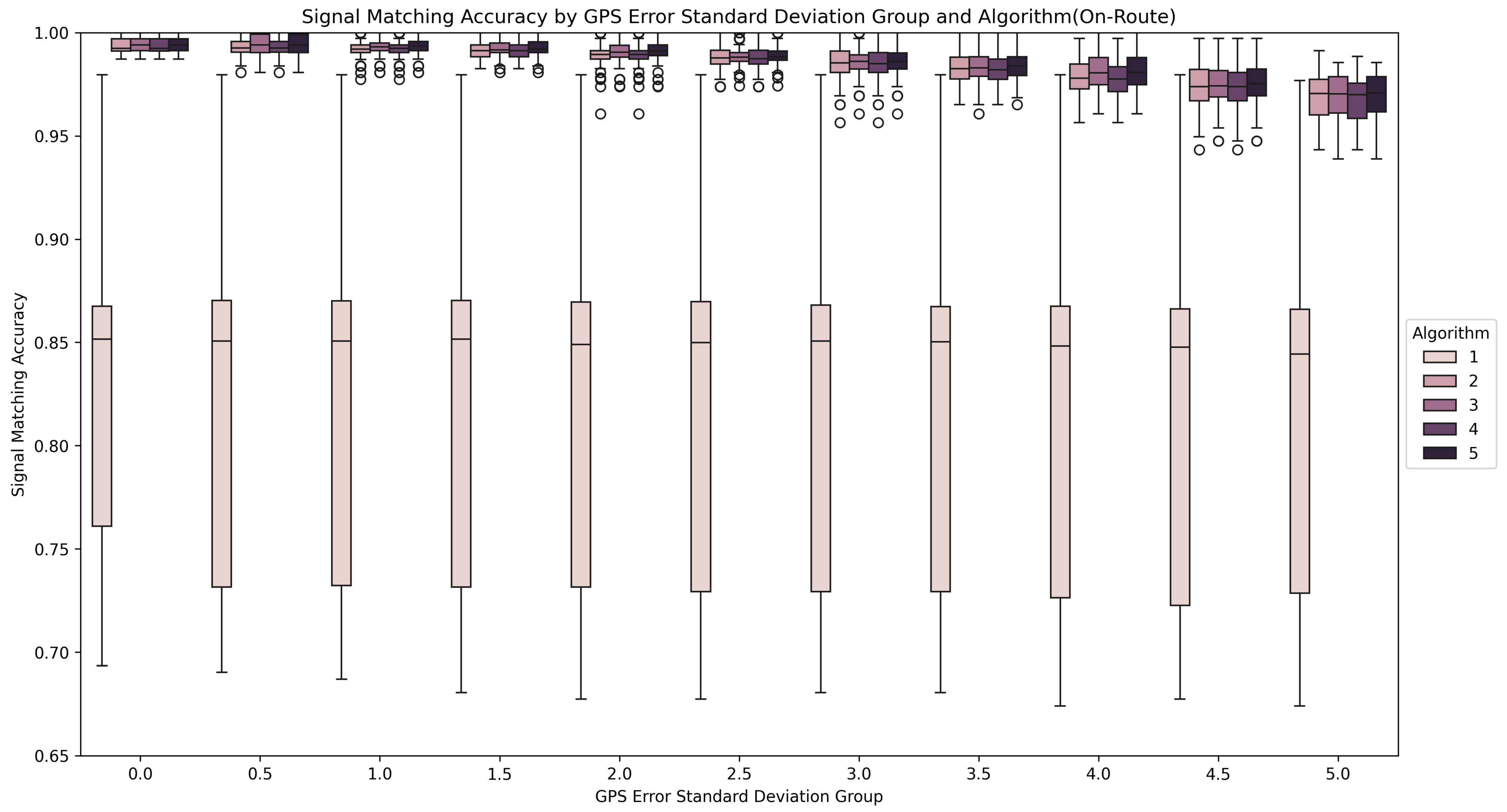 Across all test conditions, Algorithms 2–5 maintained accuracy values above 0.96, while Algorithm 1 stayed around 0.82 with little variation across groups. Unlike the other algorithms that leverage positional and filter-based corrections, Algorithm 1 depends mainly on heading consistency for signal association. Its accuracy remained nearly constant across all groups (0.82593–0.82056) but was the lowest overall. This confirms that a heading-driven geometric approach alone cannot ensure reliable signal association under increased GPS deviation. Algorithm 2, which applies Kalman filtering to correct GPS drift, achieved high accuracy under low noise levels, recording about 0.99365 in Group 1 and decreasing moderately to 0.96863 in Group 11. Algorithm 3, using predefined route information to limit the search space, sustained accuracies above 0.968 across all groups, demonstrating strong resilience against growing GPS noise. Algorithm 4 combines grid partitioning with Kalman filtering to improve spatial search efficiency; however, its accuracy decreased from 0.99365 to 0.96730 as GPS noise increased, showing that grid-based indexing can help organize candidate searches but offers limited benefit in mitigating severe positional drift. Algorithm 5, which integrates route constraints with Kalman-based position correction, consistently remained among the highest-performing methods across all groups, maintaining values above 0.993 under low-error conditions and above 0.969 even at the largest deviation. Overall, these results suggest that Algorithm 5, which first applies route constraints for signal association and then performs Kalman-based correction only when no valid match exists within the route, provides stable and robust signal-to-map association under degraded localization accuracy. The visual distributions in