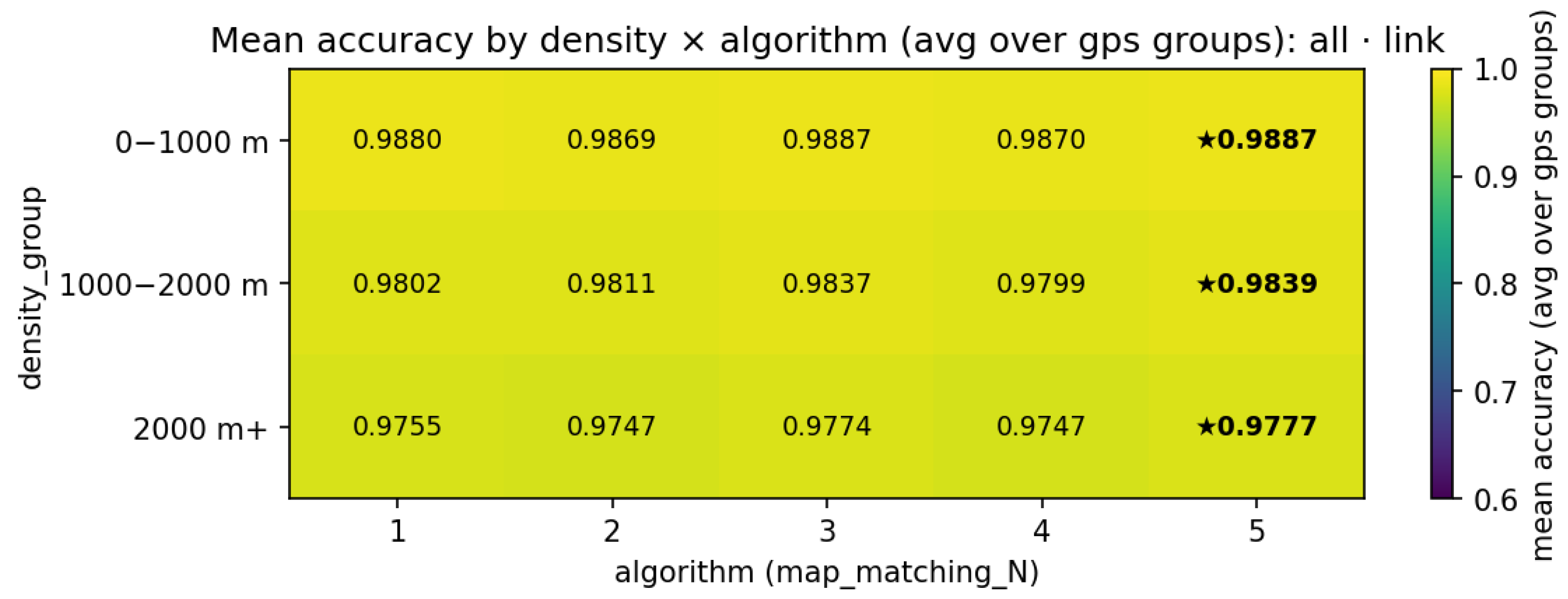 The comparative evaluation of link-matching performance across the three network-density groups shows that accuracy declines as GPS noise increases, and this decline becomes more pronounced as road networks grow denser and more interconnected. Link-matching accuracy refers to the proportion of vehicle positions at which the predicted link corresponds exactly to the ground-truth link. High-density regions contain short links, clustered intersections, and frequent heading transitions; these characteristics cause even moderate localization errors to generate multiple plausible link candidates, increasing the likelihood of adjacent-link or lateral misassignments. In contrast, low-density environments with long and sparsely connected links inherently limit such ambiguities. These overall tendencies are clearly summarized in the heatmap of density-averaged accuracies (