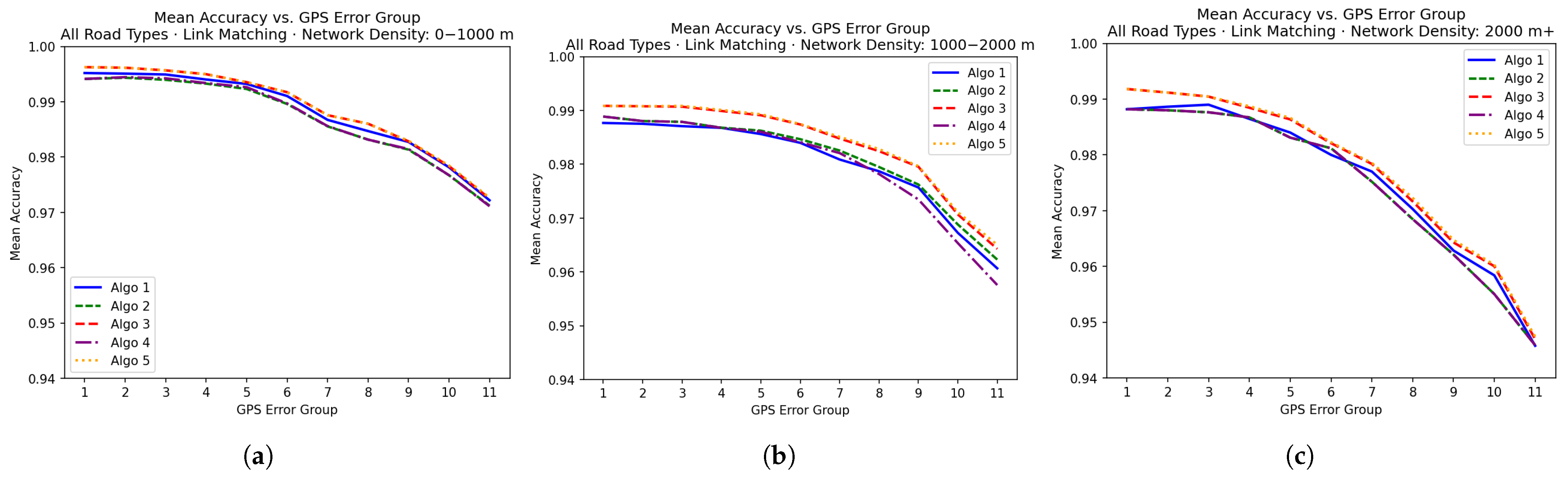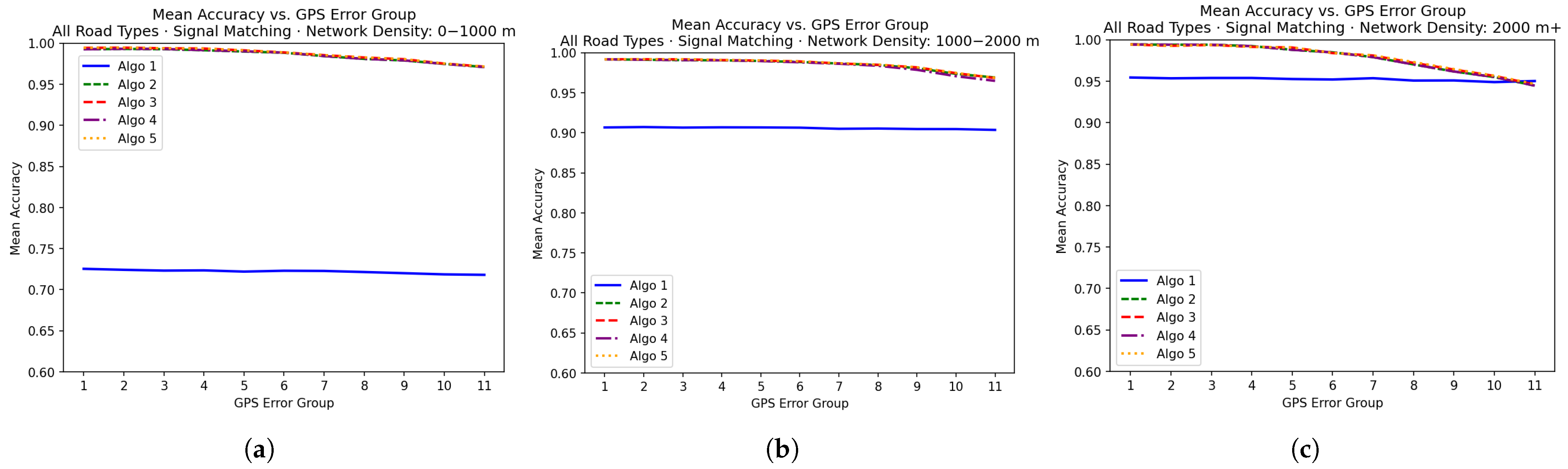 This section evaluates the sensitivity of each map-matching algorithm to variations in road-network complexity. Link- and signal-matching accuracies were analyzed across three network density levels: low (0–1000 m), medium (1000–2000 m), and high (2000 m and above). Network density was defined as the total length of all road links within a 140 m radius around each vehicle position, consistent with the criterion described in