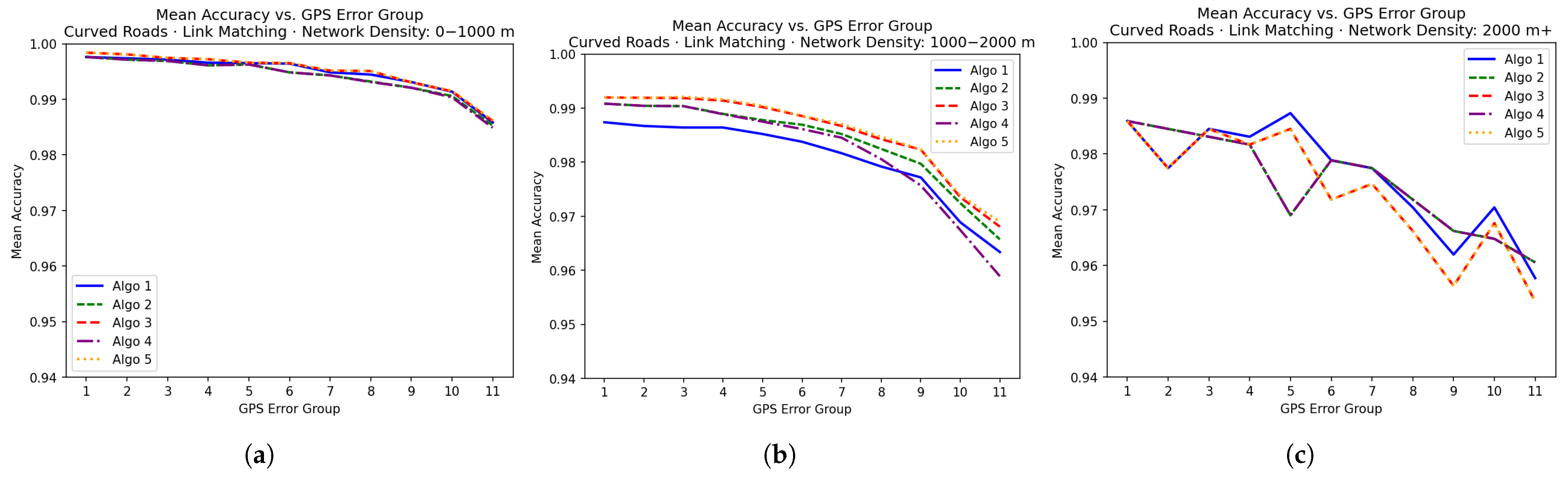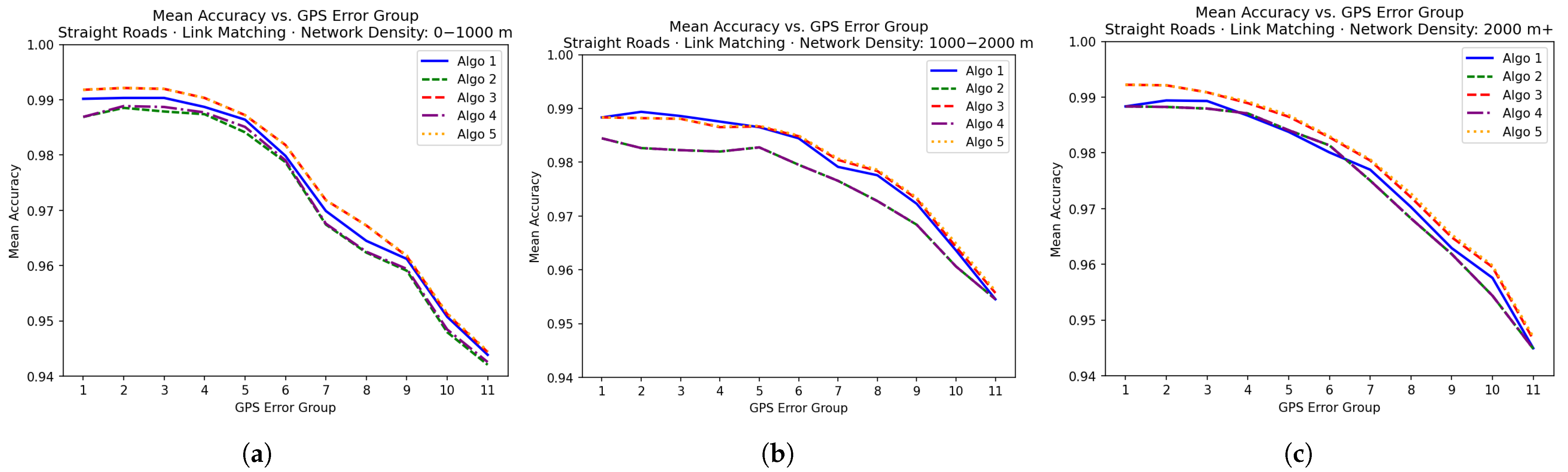 Figure 8, accuracies in low-density straight areas begin around 0.986–0.991 in Group 1 but fall sharply to 0.942–0.944 by Group 11. Medium-density straight roads exhibit a smoother decline, decreasing from roughly 0.984–0.988 to 0.954–0.956 across the same error range. High-density straight segments follow a comparable pattern, starting near 0.988–0.992 at Group 1 and dropping to approximately 0.944–0.947 in the highest error group. Unlike the low-density case, the medium- and high-density datasets do not include U-turn maneuvers. The performance degradation in these environments is therefore attributed primarily to longitudinal adjacent-link confusion rather than localized trajectory patterns. Furthermore, compared with curved segments—where geometric curvature helps separate sequential links—straight-road geometries provide no directional cues to counteract this GPS-induced ambiguity, leading to relatively larger drops. Across all straight-road conditions, Algorithms 3 and 5 demonstrate the most stable performance because their route-continuity constraints restrict abrupt transitions to neighboring links. Algorithm 5 consistently yields the highest accuracy under severe noise, indicating that its fallback Kalman update effectively suppresses the longitudinal link-switching errors that dominate straight-segment misclassifications, particularly in the U-turn region.