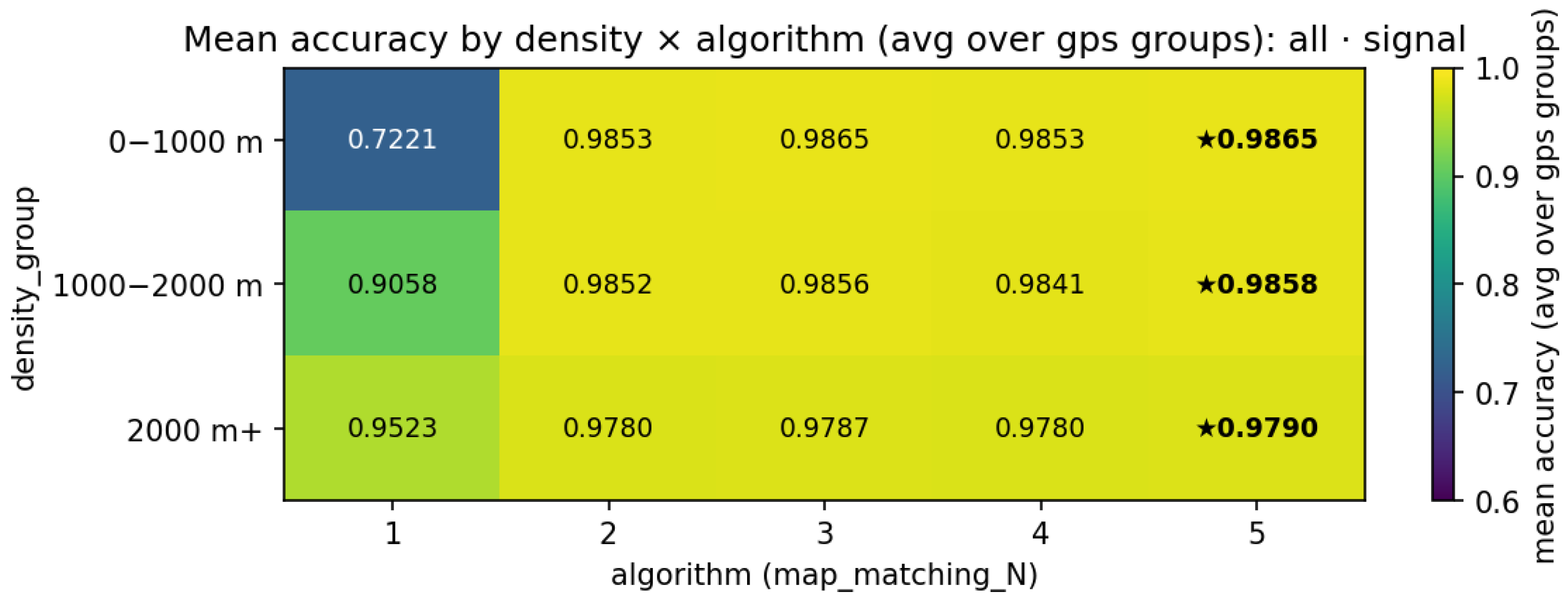 The evaluation of signal-matching performance across the three network-density groups shows trends that are broadly consistent with link matching, while also reflecting the different definition of the signal-matching metric. Signal-matching accuracy is computed only at positions where at least one ground-truth signal exists and is defined as the proportion of those positions at which the predicted signal corresponds exactly to the ground-truth signal. As a result, the denominator for signal matching is smaller than that for link matching and is concentrated around conflict points such as intersections and stop lines. In dense urban networks, multiple signals may lie within a similar distance and orientation relative to the vehicle, so even small localization errors or offset miscalculations can cause the algorithm to associate the vehicle with an incorrect signal along the same or a neighboring link. In contrast, low-density environments tend to have fewer, more isolated signals, which naturally limit such ambiguities.