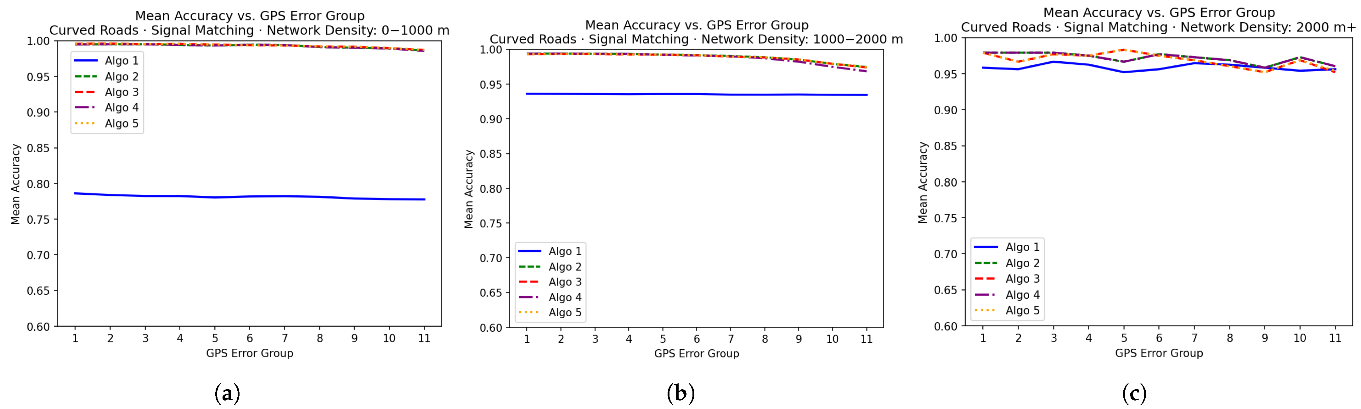 Section 4.2.1, continuous heading changes along a curve provide strong directional cues that help distinguish adjacent links even under GPS drift. Because signal association is performed only after a link has been correctly identified, the improved separability of neighboring links directly contributes to higher signal-matching stability on curved roads. In low-density curved regions, signal accuracies remain high across all algorithms, beginning around 0.994–0.995 in Group 1 and remaining above 0.985 by Group 11. Medium-density curves show slightly larger reductions, decreasing from approximately 0.993–0.994 at Group 1 to about 0.968–0.974 in the highest error group. High-density curved networks exhibit the sharpest drops within this road type, with values falling from roughly 0.979 at Group 1 to 0.952–0.960 at Group 11. Across all curved-road conditions, Algorithms 2 and 4 show slightly higher accuracies in medium- and high-density areas due to their Kalman-based smoothing, which helps stabilize heading variations and maintain more reliable link associations under increased GPS noise. Algorithm 5 also maintains strong and consistent performance across all curved densities, although the Kalman-related advantage of Algorithms 2 and 4 becomes marginally more visible when the road geometry contains prolonged curvature and the density of surrounding links increases. Overall, these results indicate that the geometric continuity of curved road segments facilitates more stable link identification, which in turn supports more reliable signal association compared with straight-road environments where adjacent-link ambiguity is more severe.