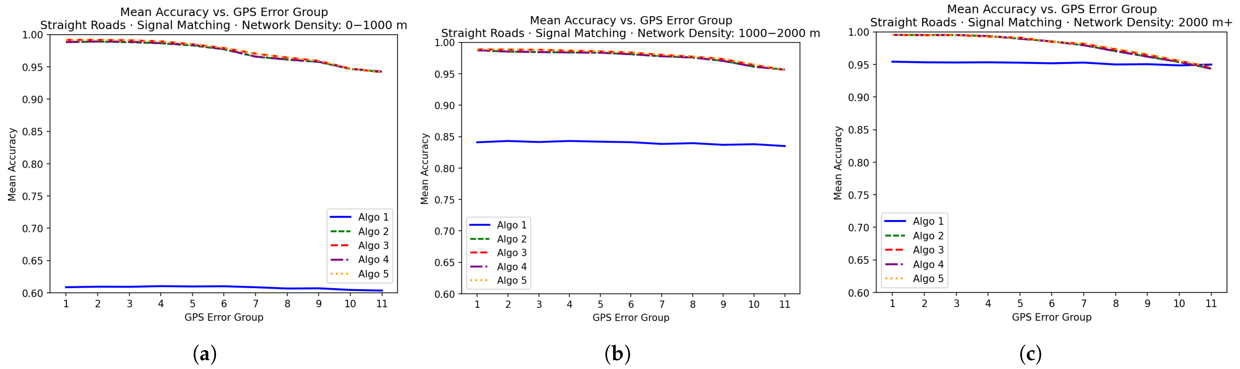 Figure 12, exhibit more pronounced signal-accuracy degradation than curved segments as GPS noise increases. On straight approaches, multiple signals often lie along the same alignment, and GPS drift can shift the estimated position forward or backward along the corridor, causing the associated stop-line to be confused with the next or previous signal. This effect mirrors the adjacent-link ambiguity observed in straight-segment link matching and becomes more influential as road networks grow denser. In low-density straight networks, Algorithms 2–5 begin in the 0.988–0.991 range at Group 1 but decline to approximately 0.941–0.942 by Group 11. These baseline values remain lower than those of curved segments because straight approaches provide fewer geometric cues for distinguishing among longitudinally aligned signal candidates. Medium-density straight regions start near 0.987–0.988 and decrease steadily to approximately 0.955–0.956 as GPS noise intensifies. High-density straight segments follow a similar trend but terminate slightly lower, converging to the 0.943–0.946 range at the highest error group. Across straight-road conditions, Algorithms 3 and 5 benefit from route-continuity constraints, which narrow the candidate signals to those associated with links on the predefined path and thereby reduce confusion among closely spaced stop lines. However, Algorithms 2 and 4 remain competitive when GPS errors are large, since Kalman-based smoothing limits abrupt jumps in the estimated stop-line position and stabilizes offset computations along the corridor. Overall, Algorithm 5 delivers the most robust performance across densities and geometries by combining route-based filtering with selective Kalman correction, while Algorithms 2 and 4 provide particularly strong signal-matching robustness in dense, curved environments where temporal smoothing of the trajectory is most effective.