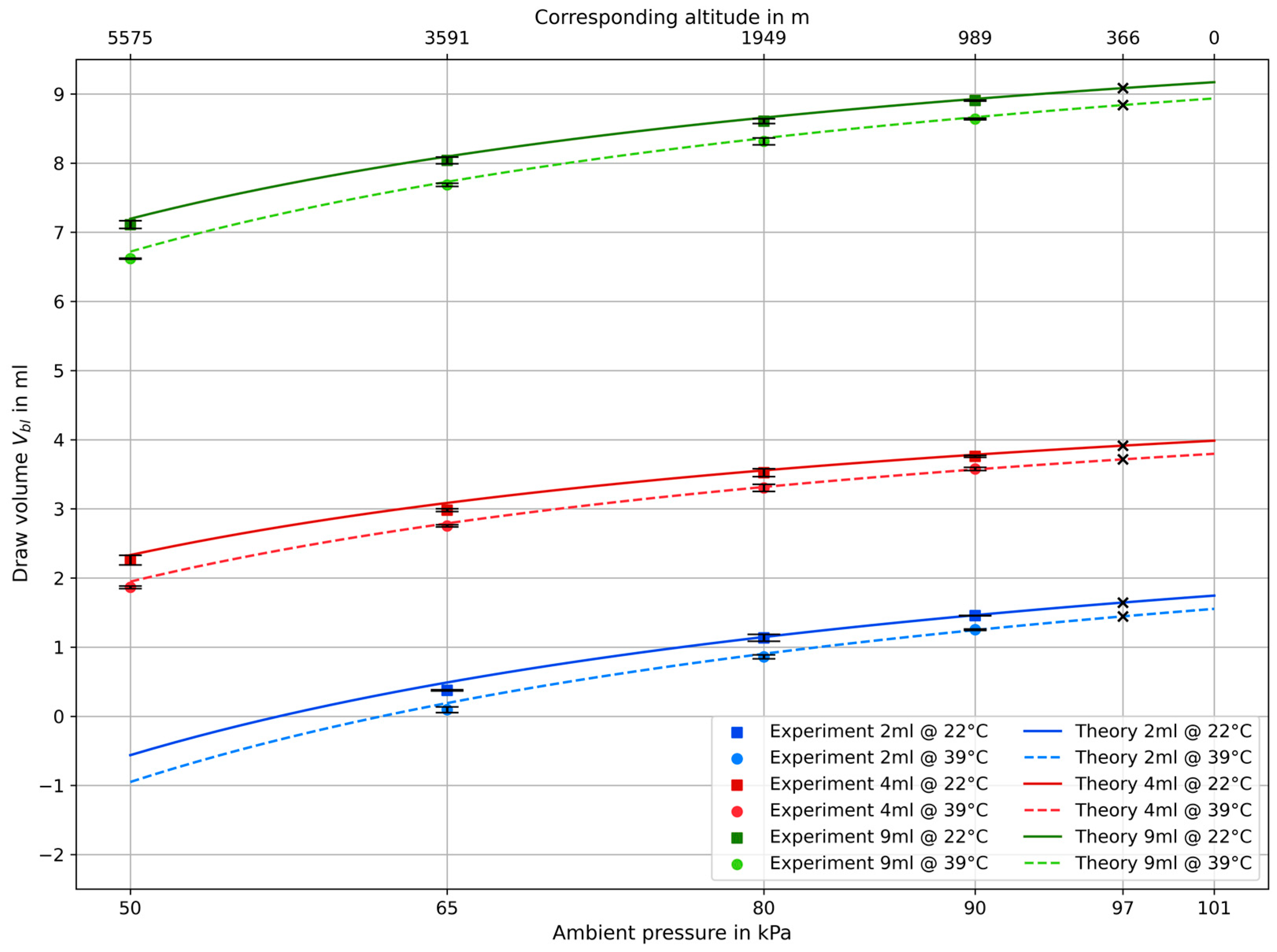 Figure 1). The agreement between model and experiment is further reflected in the root-mean-square errors, which were 66.032 µL, 66.654 µL and 58.128 µL for the 2 mL (2025), 4 mL and 9 mL tubes at 22 °C, respectively, and 60.686 µL, 45.514 µL and 61.791 µL for the corresponding tubes at 39 °C. The sensitivity of evacuated tubes to changes in ambient pressure is particularly pronounced in tubes with low fill ratios, which exhibit strong altitude-dependent variation in draw volume (see
