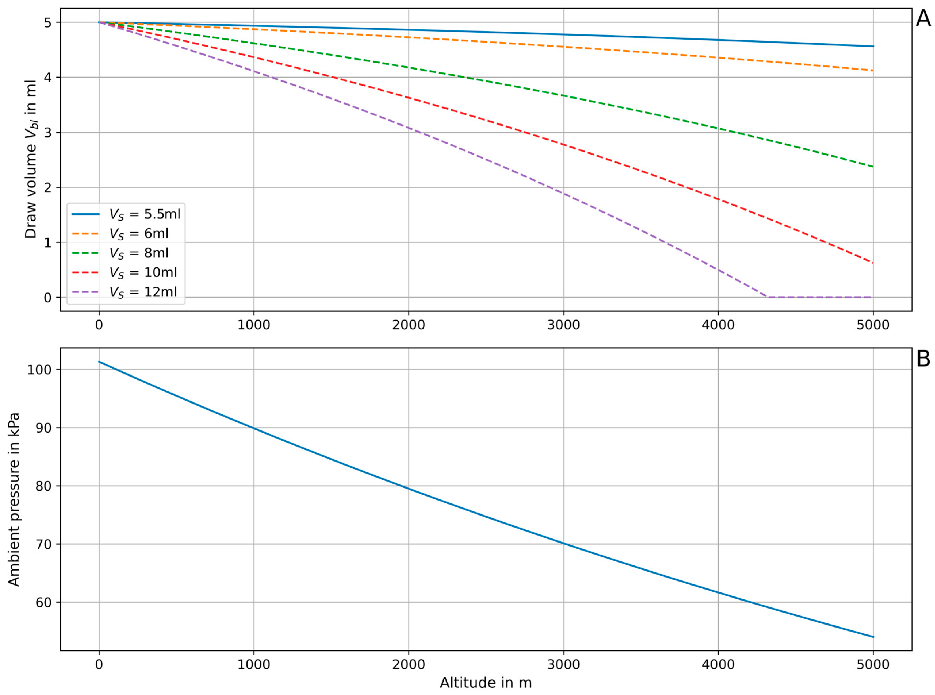 8]. Furthermore, employing evacuated tubes with low nominal draw volumes at elevated altitudes entails a potential risk of air embolism when ambient pressure falls below the tube’s internal vacuum, inverting the pressure gradient and enabling air to enter the blood collection set and, ultimately, the patient [