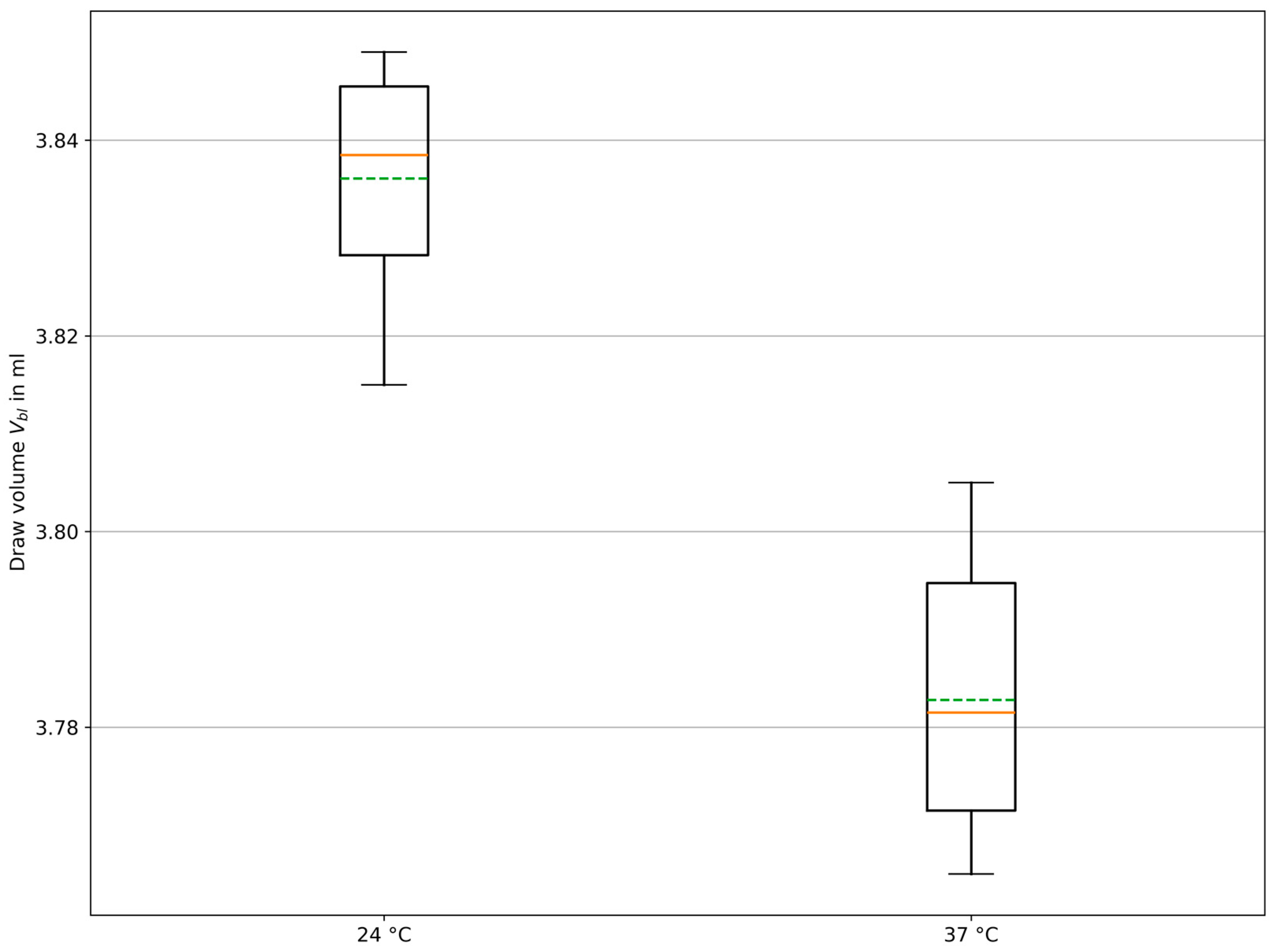 21], the resulting discrepancy introduces a systematic bias into the calibration process: tubes calibrated under standard conditions will inherently deviate from their intended draw volume when used at physiological sample temperatures, unless this temperature difference is explicitly accounted for.