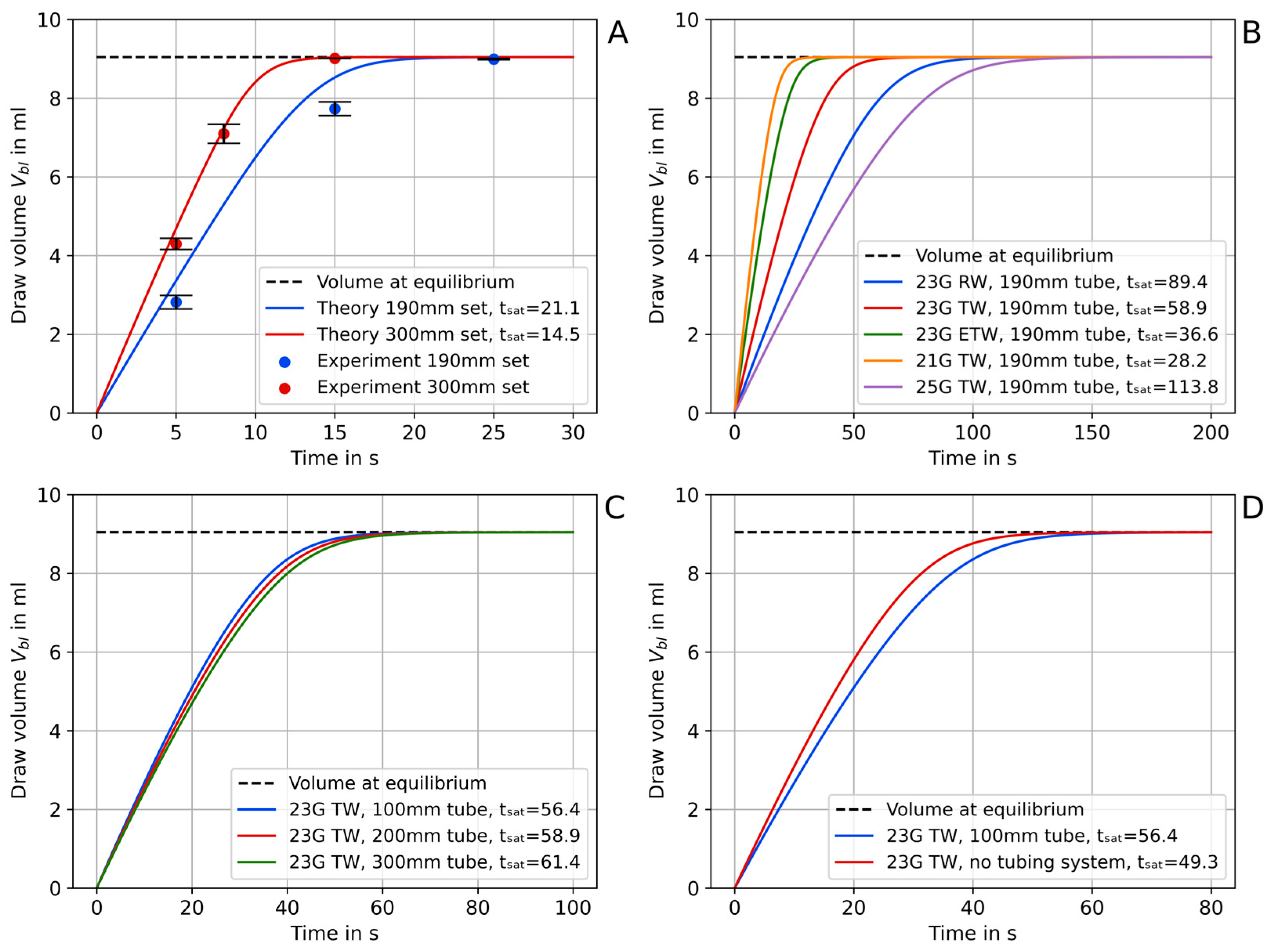 Figure 4A shows the comparison between the experimental data and the model predictions. While the agreement is not perfect, the results are reasonably consistent, considering the pronounced temporal sensitivity of the measurement process and the substantial influence of the measured diameters of the blood collection sets. The relatively larger deviation observed for the shorter 190 mm set may be attributed to potential measurement inaccuracies, whereas the longer 300 mm set exhibits better agreement. Resulting root-mean-square errors amount to 0.558 mL for the 190 mm set and 0.239 mL for the 300 mm set. The measurement data used for this experimental validation are listed in