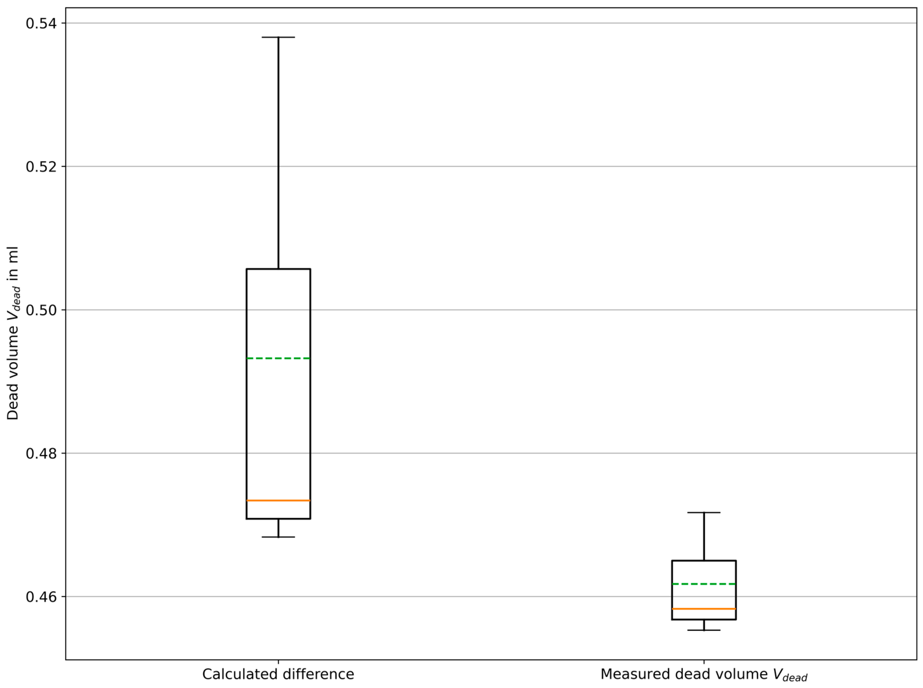 The normal distribution of both measurement series was again checked using the Shapiro–Wilk test ( = 0.125 for the calculated difference and = 0.330 for the measured dead volume ). The statistical significance between the calculated difference and the measured dead volume was checked using a two-sample t-test for dependent samples and resulted in a -value of = 0.325. Thus, it can be assumed that both measurements are equal.
