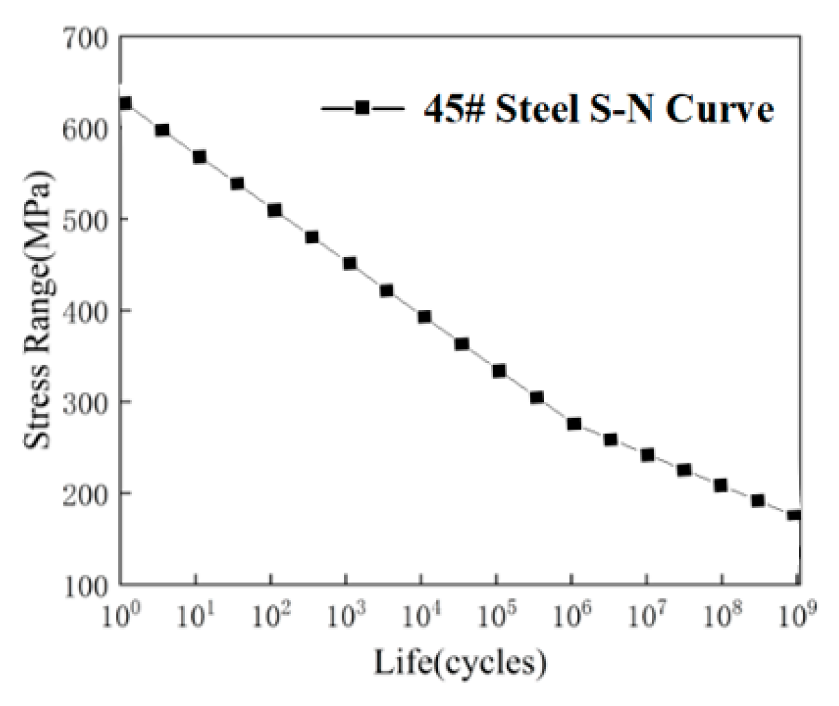 Table 1. This notched plate configuration mimics typical fatigue-critical details (e.g., mounting holes) found in automotive chassis components. The fatigue characteristics of the material are defined based on the S-N curve presented in