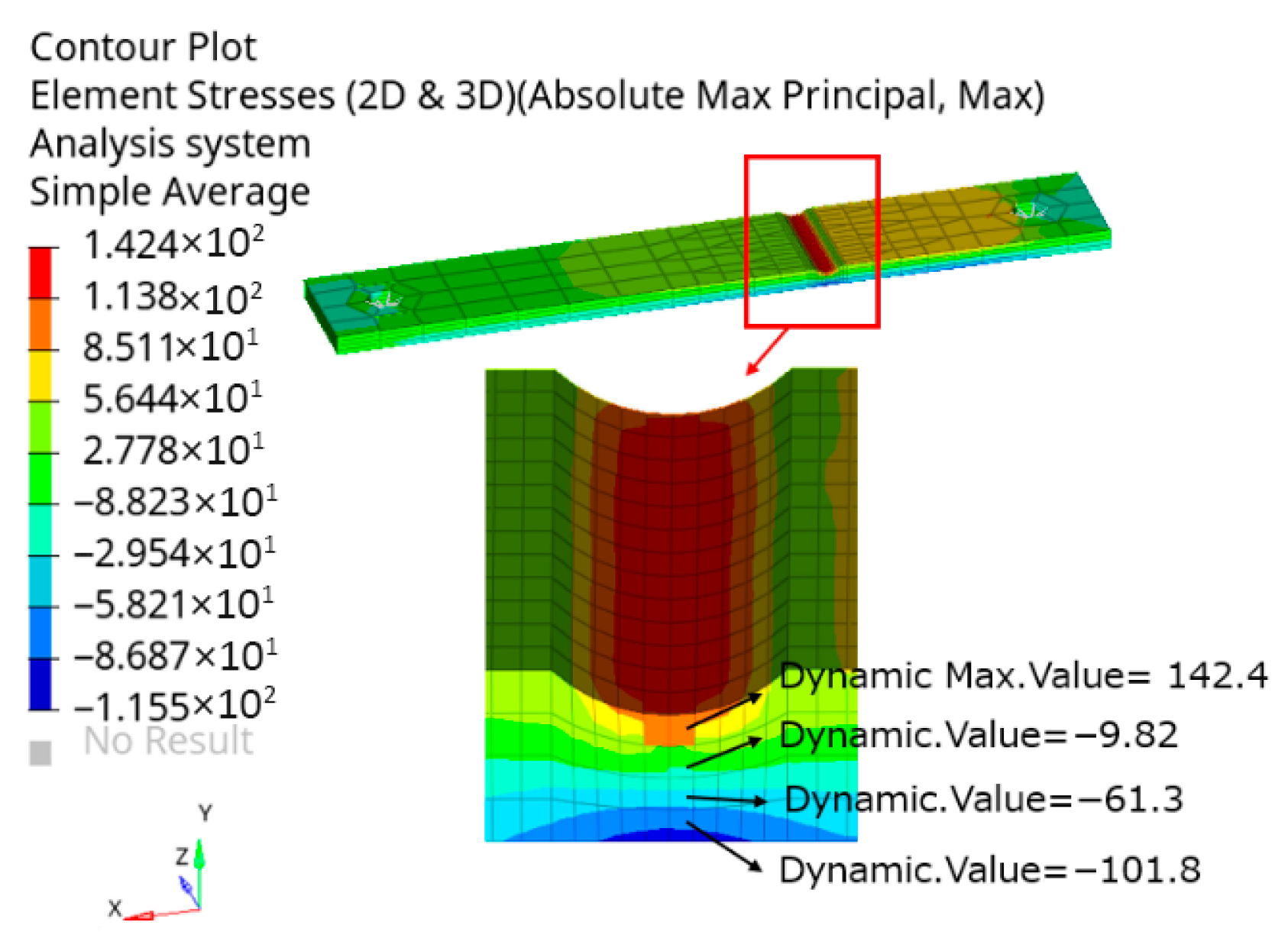 The critical region was identified through frequency response analysis. The notched plate was fully constrained at the left hole and subjected to a 1G acceleration excitation in the Z-direction. The results presented in