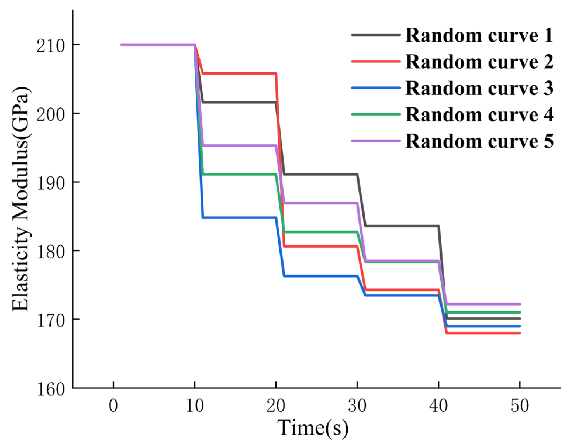 34]. Consequently, the training dataset incorporates modulus reductions up to 20% to conservatively envelope the degradation scenarios. It should be noted that Young’s modulus is traditionally determined via static tensile tests on standard specimens. However, in the context of fatigue analysis, its evolution under cyclic loading serves as a critical indicator of material state degradation. The approach adopted here captures this dynamic stiffness loss, which is essential for accurately modeling the stress response in later fatigue stages. Fatigue damage accumulation necessitates stress response data of sufficient duration. Given the minimal variation in elastic modulus over short timescales, its degradation is approximated as a staged stepwise reduction. Five distinct sets of elastic modulus degradation patterns are constructed in this study. Each dataset comprises five segments with randomized reduction rates, where the elastic modulus remains constant within individual segments, as depicted in